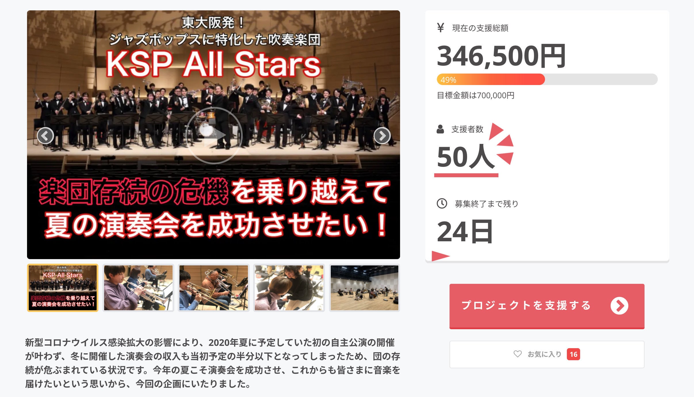 そして!支援総額が50%(あと1%です…)を達成したと同時に、新作のテレワーク吹奏楽動画をYouTubeチャンネルにて投稿します!