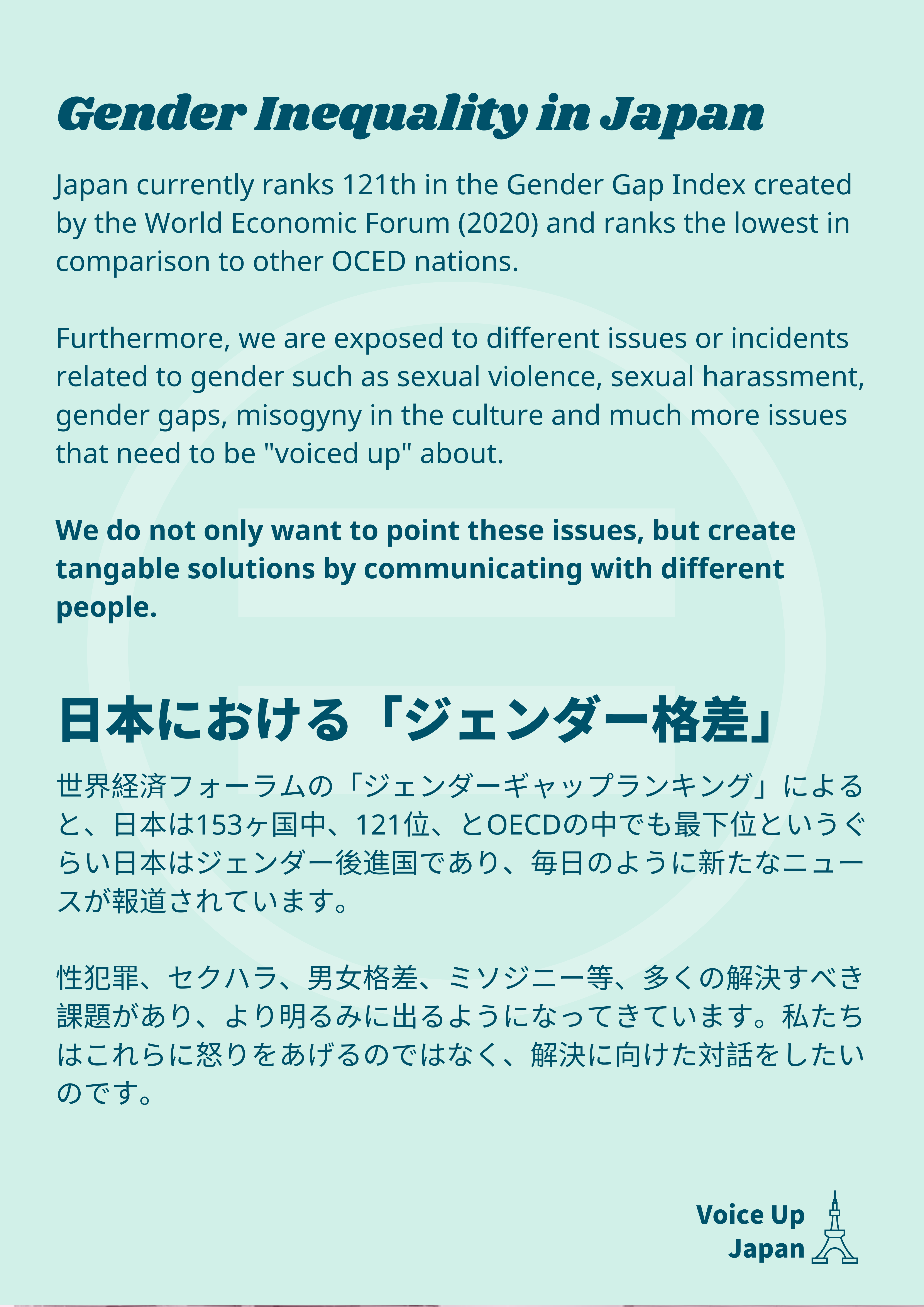 Japan is still very behind in Gender Equality where theres a new headline almost every other day whether it's regarding sexual violence, sexual harassment, gender inequality , or a sexist comment. There are many issues regarding gender that are barely hitting the headlines yet.