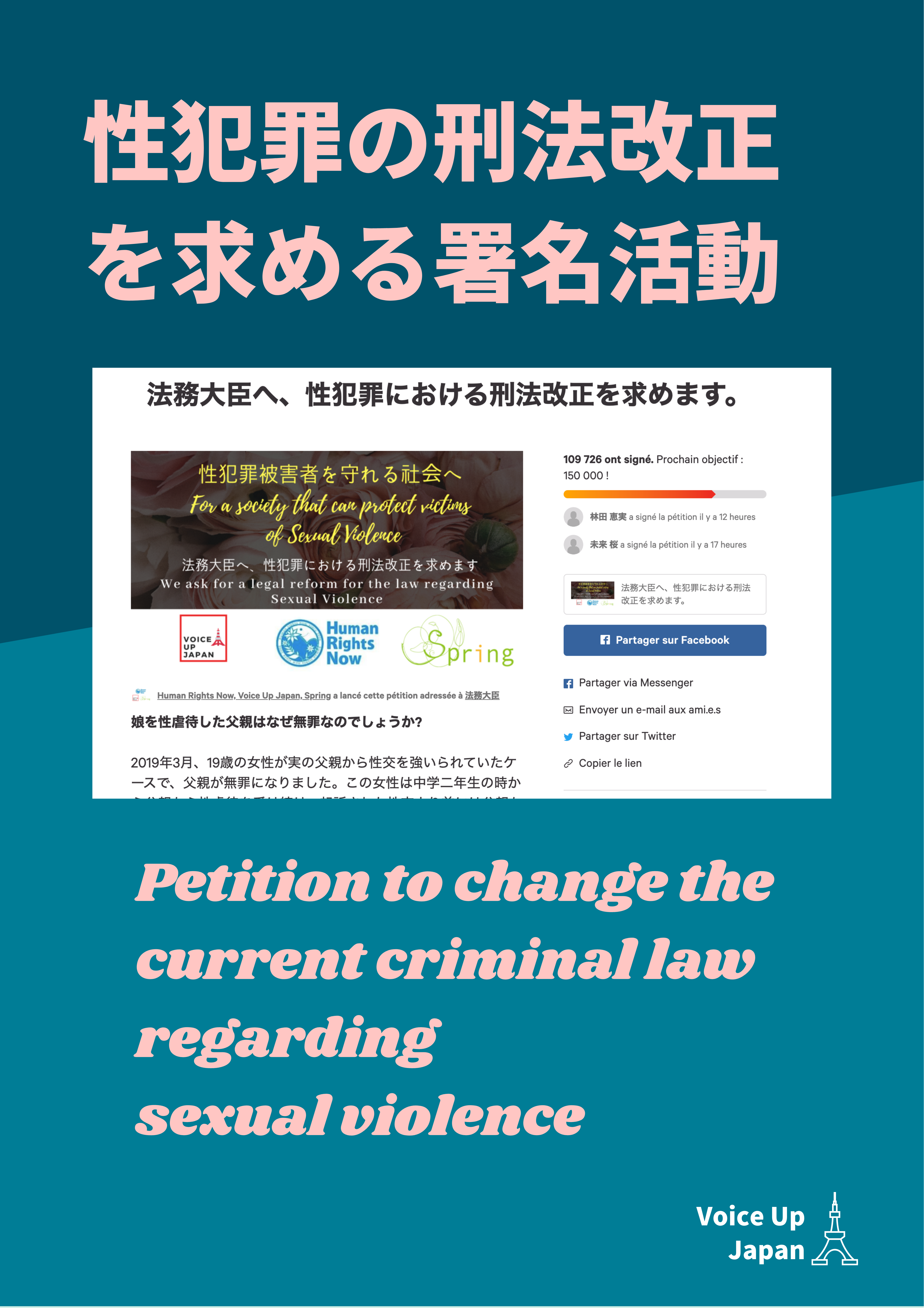 Voice Up Japan started a petition along with Human Rights Now and Spring to change the criminal law regarding sexual violence after hearing about the case where a man who raped his own daughter was ruled innocent.