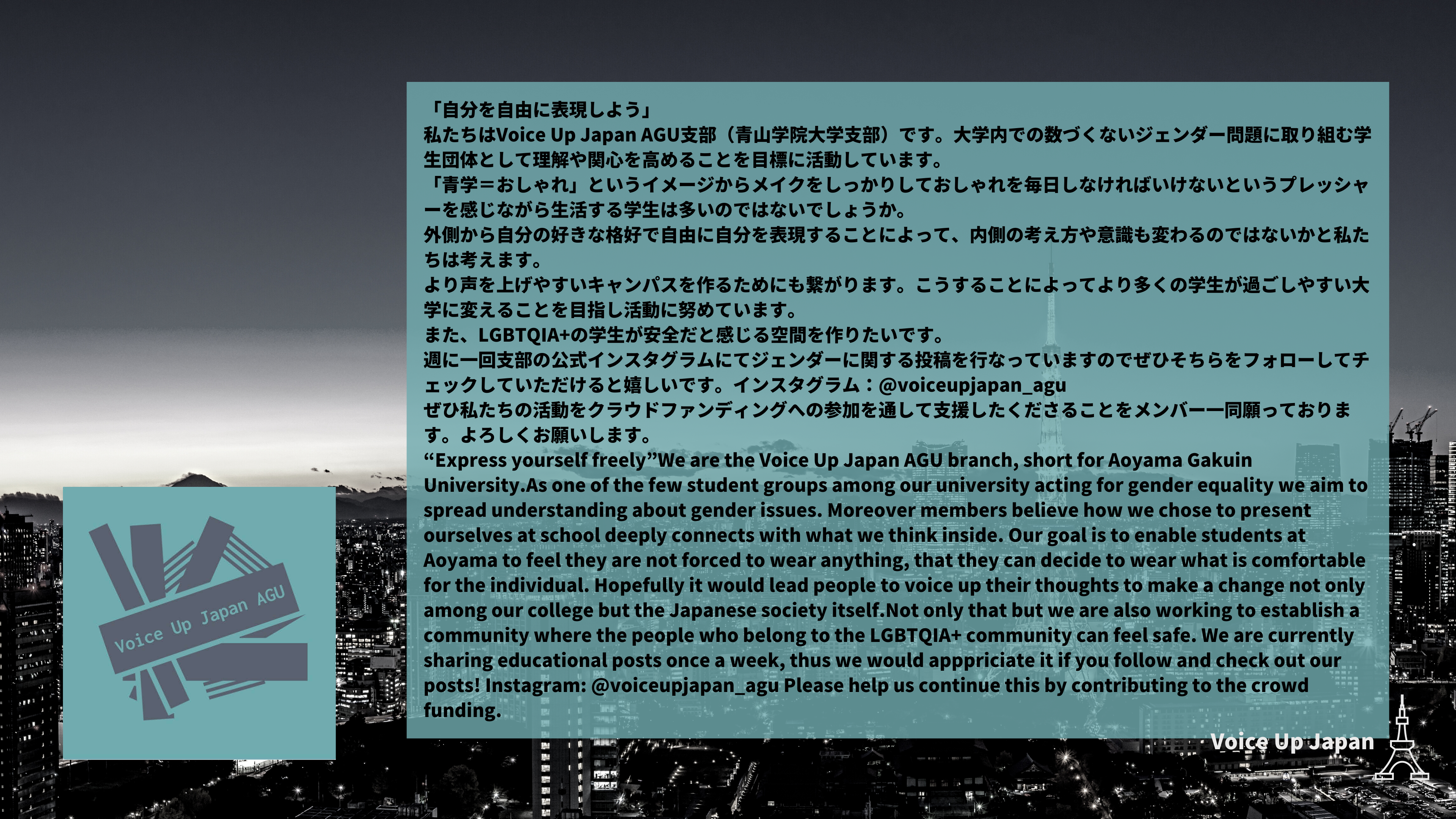 ※For those who want to know more about sponsorships and collaborations, please contact voiceupjapan@gmail.com to receive more information. Once the Crowdfunding ends, we will send each enterprise/organization an email regarding more information. Please make sure you have your company/organizational logo ready in .ai and .jpg/.png.