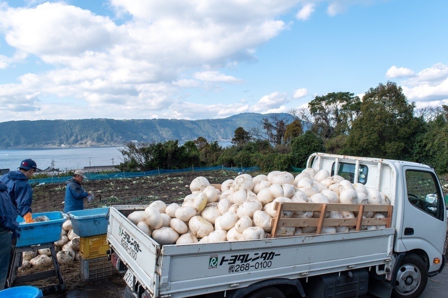 僕たちは約1年前から村山利清さん(桜島大根農家)の畑でお手伝いをするようになりました。利清さんは主に一人で農作業をされていて、桜島大根をはじめ桜島小ミカン・ナス・ピーマンと大忙し。特に、桜島大根は1日で2トン収穫するなんてざらです…