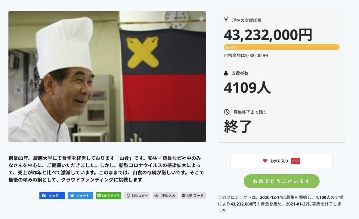 ===============================皆様こんにちは。山食の谷村です。この度はクラウドファンディングにご支援いただきありがとうございます。お陰様で目標金額を達成することができました。本当にありがとうございます。この立ち上げに、慶應義塾の管財部、広報室、塾員センター、塾生新聞会の方々にも大変お世話になりました。本当にありがとうございます。この大切な資金は山食存続のため活用させていただきますので、これからも山食のご支援をよろしくお願い申し上げます。===============================
