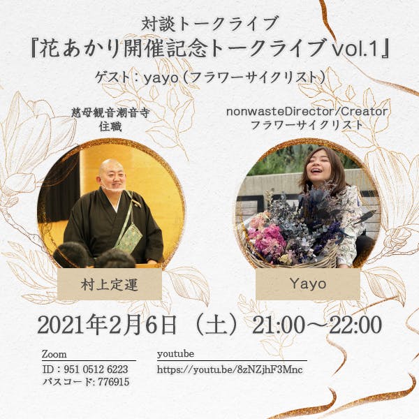 花あかり当日を約1カ月後に控えた2月6日、このプロジェクトを率いる潮音寺の住職・村上定運がオンラインで対談イベントを開催しました。お相手は、新たに追加されたリターン品を手掛けるフラワーサイクリスト・Yayoさんです。