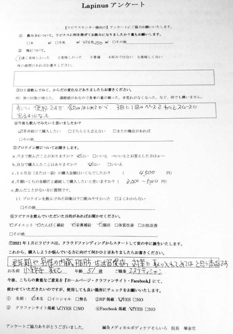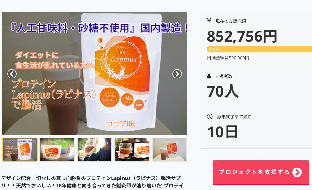 2021/02/03 12:34『達成率200% 77名の支援者 1,003,276円』”プロテインLapinus(ラピナス)で腸活”のクラウドファンディングが終了いたしました。沢山の方から叱咤激励をいただきながら最後まで全力で進むことができました。改めて応援していただいた皆様に感謝申し上げます。 私のチャレンジはこれからが本番になります。全国の皆様に知っていただきラピナスを飲んで健康に人生を過ごしていただくことがこのプロテインを作ったキッカケになります。今後の活動のためにも、ラピナスを飲んだ感想やご質問をいただけると大変嬉しいです。 今後の新たな情報などもお知らせさせていただきたいと思っております。 これから皆様の健康をサポートさせていただくためにお付き合いいただけましたら幸いです。現在、リターン品をお届けする準備を進めております。もうしばらくお待ち下さい。今回、ご支援いただいた皆様応援ただいた皆様。ありがとうございました!これからも走り続けます。鍼灸メディカルボディケアそらいろ 院長 堀金宏 もっと見る
