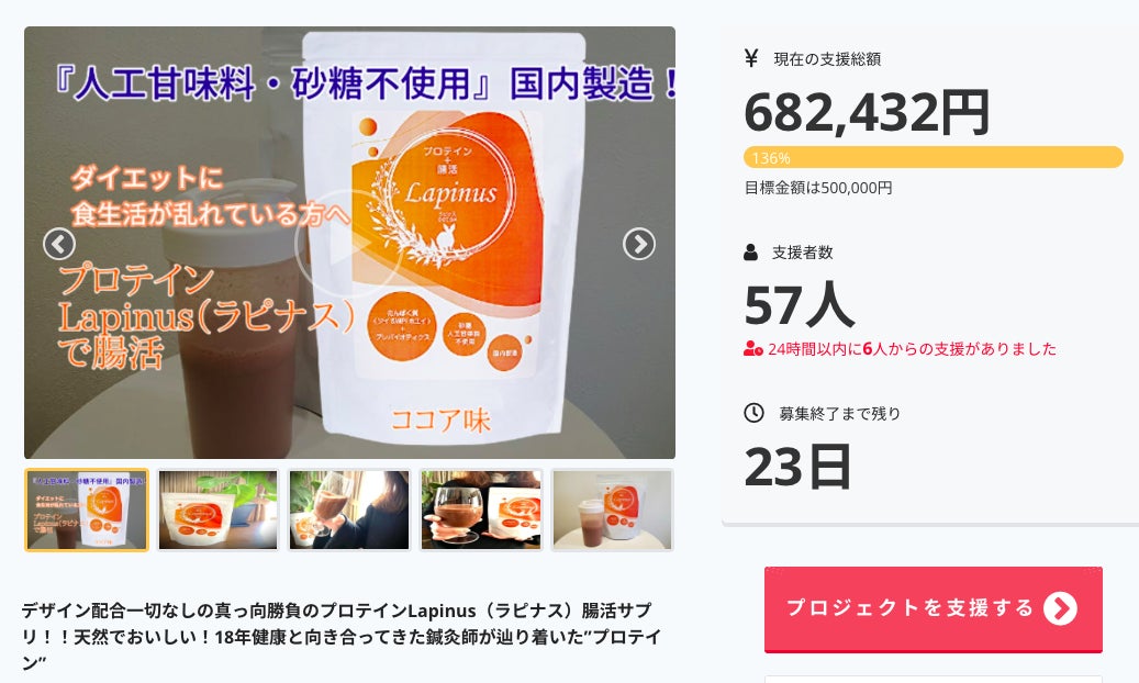 1月4日よりスタートしたクラウドファンディングですが、緊張と不安でいっぱいのスタートでした。 1日目で達成率98%!!感謝しかありませんでした。 個人的に応援メッセージをくれる方、コメントやいいね!で応援してくれる方、そして、ここまで来るのにたくさんの方に協力をいただきました。 やり慣れない初めてのFacebookでのライブ配信も、少しでも多くの人にこのプロテインを知ってもらい、『全国の人を健康に笑顔にしたい』その思いだけで必死でメッセージを伝え続けました。 今後は、子育てしているお母さん、毎日時間がなく食事もまともに取れないビジネスマン、より健康になりたい方、ダイエットを何度も失敗している方へラピナスで『健康に笑顔で過ごしていただきたい』そのために、もっと多くの方の元へお届けしたいです!!  1月30日までの期間になりますので、まだまだ、全力で走り続けます。ここまで、ご協力いただいた支援者さまに感謝いたします。