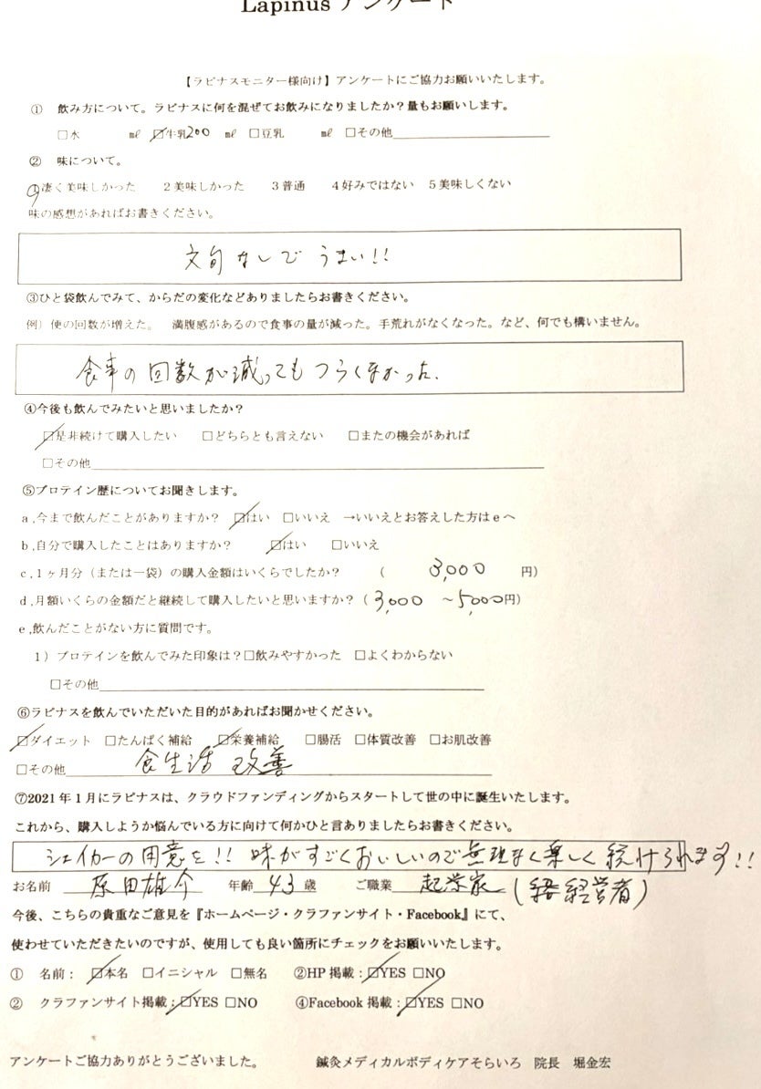 2021/02/03 12:34『達成率200% 77名の支援者 1,003,276円』”プロテインLapinus(ラピナス)で腸活”のクラウドファンディングが終了いたしました。沢山の方から叱咤激励をいただきながら最後まで全力で進むことができました。改めて応援していただいた皆様に感謝申し上げます。 私のチャレンジはこれからが本番になります。全国の皆様に知っていただきラピナスを飲んで健康に人生を過ごしていただくことがこのプロテインを作ったキッカケになります。今後の活動のためにも、ラピナスを飲んだ感想やご質問をいただけると大変嬉しいです。 今後の新たな情報などもお知らせさせていただきたいと思っております。 これから皆様の健康をサポートさせていただくためにお付き合いいただけましたら幸いです。現在、リターン品をお届けする準備を進めております。もうしばらくお待ち下さい。今回、ご支援いただいた皆様応援ただいた皆様。ありがとうございました!これからも走り続けます。鍼灸メディカルボディケアそらいろ 院長 堀金宏 もっと見る