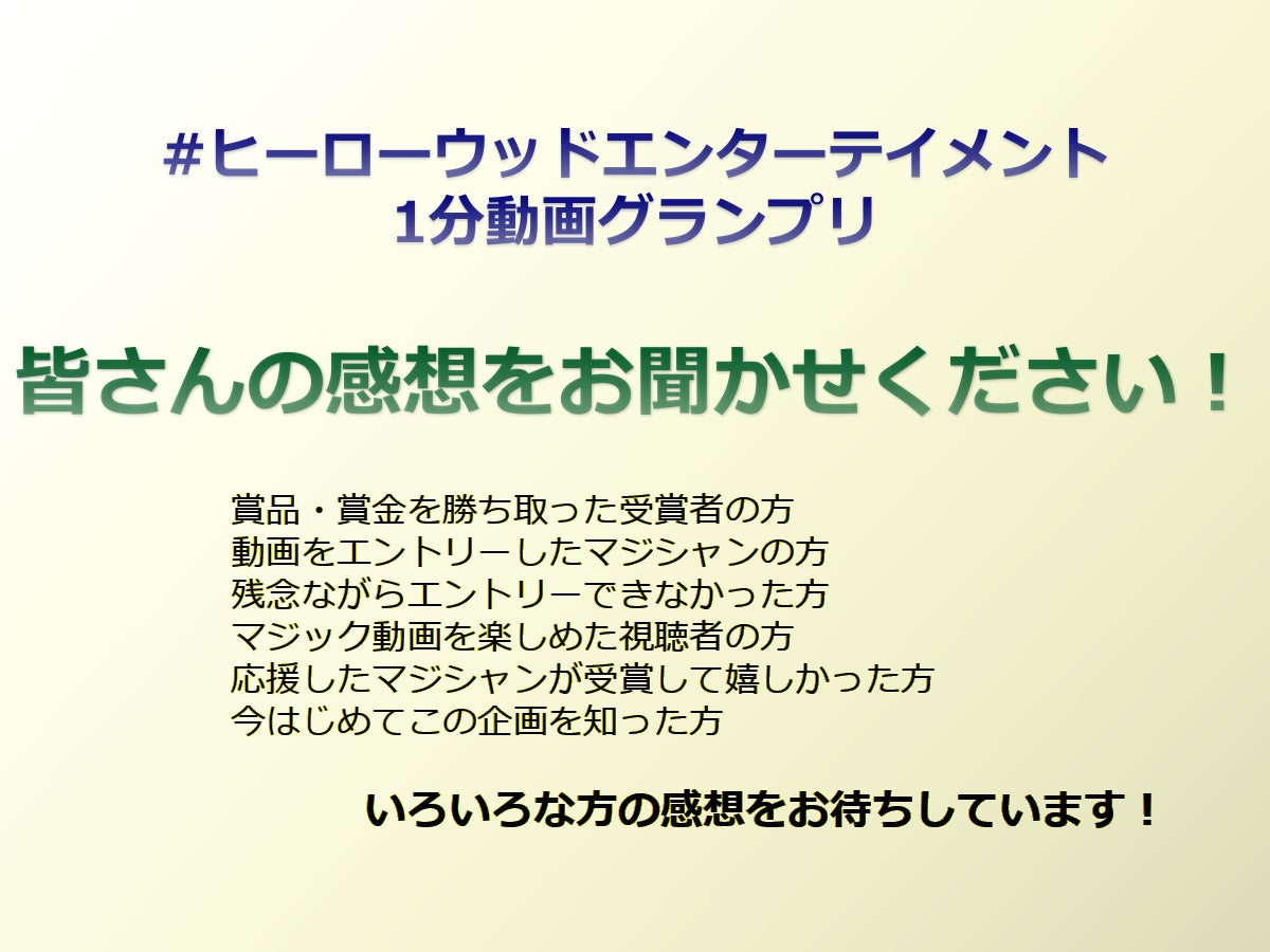 Twitterで感想を募っておりますので、企画に対する感想、マジシャンの演技に対する感想、ゲストのコメントに対する感想などありましたら、ぜひお声をいただけると助かります。