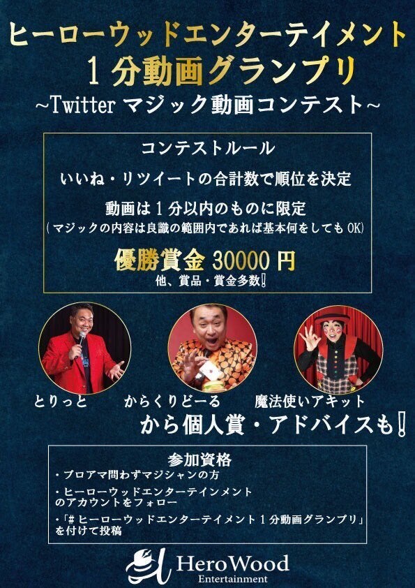 ヒーローウッドエンタ-テイメントの廣木涼です。おかげさまで、Twitterマジック動画コンテストが無事開催できる運びとなりました。ぜひ、皆さんもチェックしてみてください。https://twitter.com/herowood2019/status/1371386506598699009この企画を拡散すればするほど、多くのマジシャンたちに活躍の機会が広がることになりますし、多くのエンタメ動画が作られることになりますし、多くの視聴者が無料でマジック動画を楽しむことができるようになります。こういう企画が実現しましたのも、プロジェクトに支援していただいた皆さまのご協力あってのことです。本当にありがとうございました。そして、引き続き、リツイートなどでご協力いただけますと助かります。笑顔でいるのが難しくなった今の世の中に、マジックで笑顔を広げていけることを願って。