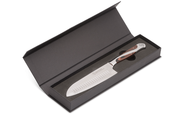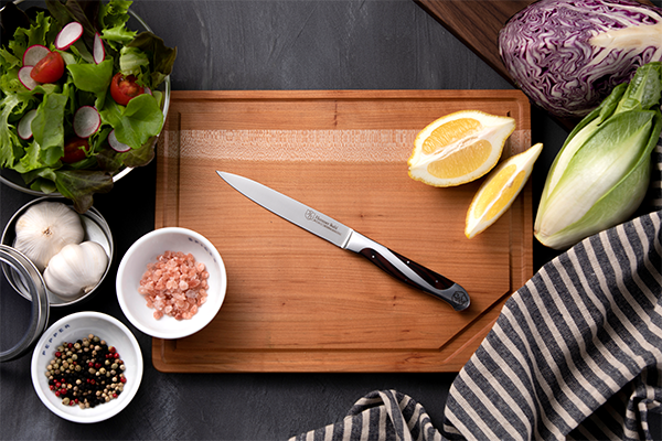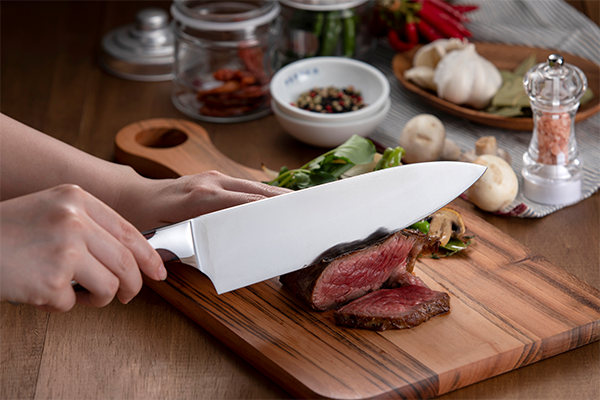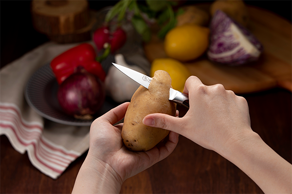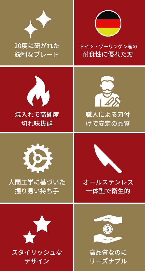 ナイフのブレードは世界クラスの最先端のレーザーによって20度に鋭く正確に研がれ、鋭い切れ味を保ちます。さらに焼入れを行うことで硬度が高まり、食材がより切れやすくなっています。