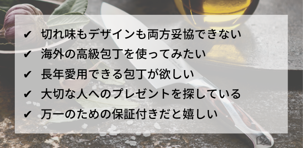 切れ味の持続性や刃の耐性が高く、長く愛用できる包丁をお探しの方におすすめです。