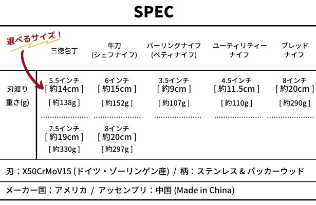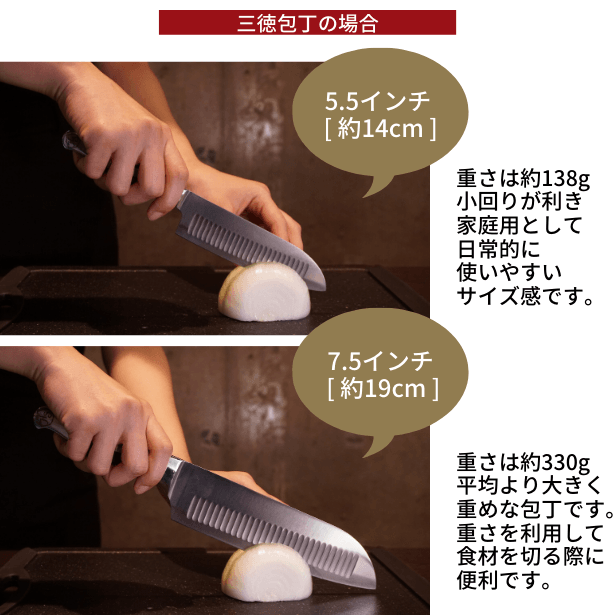 三徳包丁と牛刀(シェフナイフ)は2種類のサイズをご用意しております。お好みや手の大きさに合わせて刃渡りをお選びいただくことができます。
