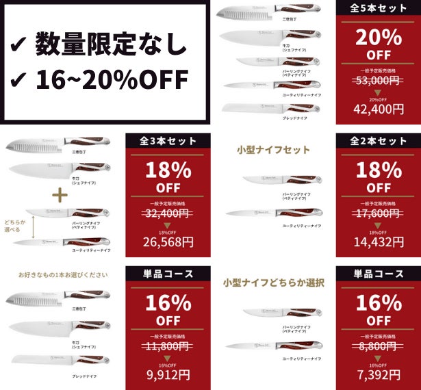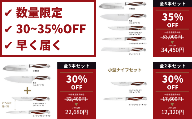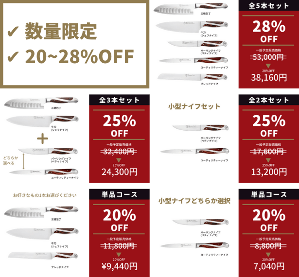 2021/01/17 20:06Hammer Stahlナイフのプロジェクト運営チームです。ご支援、お気に入り登録いただきまして誠にありがとうございます。今回レポートではおすすめのリターンについてご紹介させていただきます。【プロジェクト運営担当者が最もおすすめするリターン】以下のコースは国内倉庫にて既に商品が用意されておりますため、プロジェクトが終了次第(1月末)すぐに商品が発送されます。支援後に商品到着をお待ちいただく期間が短く、すぐにお使いいただけることがポイントです!ーーーーーーーーーーーーーーーーーーーーーー・5本セット 35%OFF→コースの中で最も安く包丁が全種揃います。・3本セット 30%OFF→コースの中で最も安く主要ナイフが揃います。 ・2本セット 30%OFF→コースの中で最も安く小型ナイフが揃います。ーーーーーーーーーーーーーーーーーーーーーーまた各コース本数が限られておりますため、お早めにご検討ください!良質な製品をお届けできるよう頑張って参りますので、どうぞ今後ともHammer Stahlナイフのプロジェクトを温かく見守ってくださいますようお願いいたします。何かご質問などございましたら、お気軽にご連絡くださいませ。よろしくお願いいたします。 もっと見る