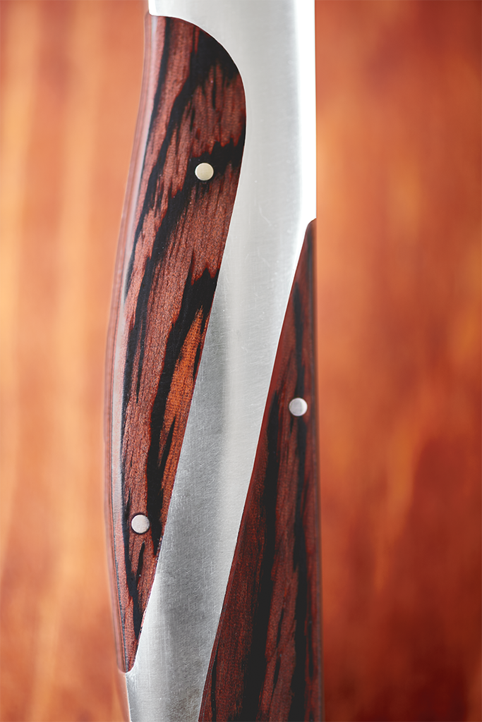 木材にはパッカーウッドという天然の木板を特殊な樹脂で何層にもコーティングし圧着したものを使用しています。通常の木製ハンドルでは水が染み込み腐食しやすい部分を、パッカーウッドにすることで、水が染み込みにくく柄が腐りにくいため美しいデザインが長持ちします。
