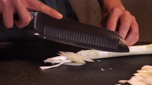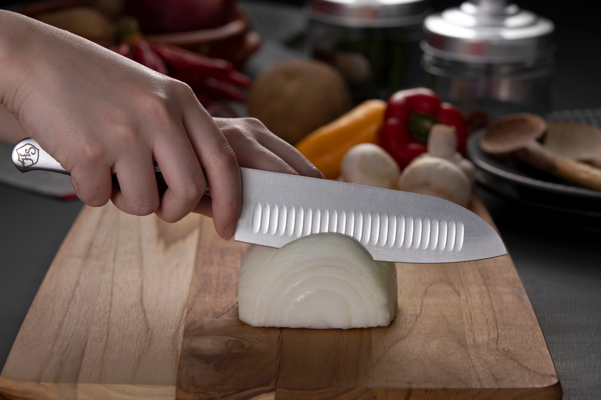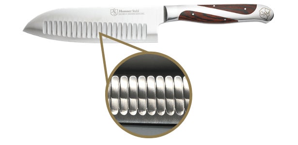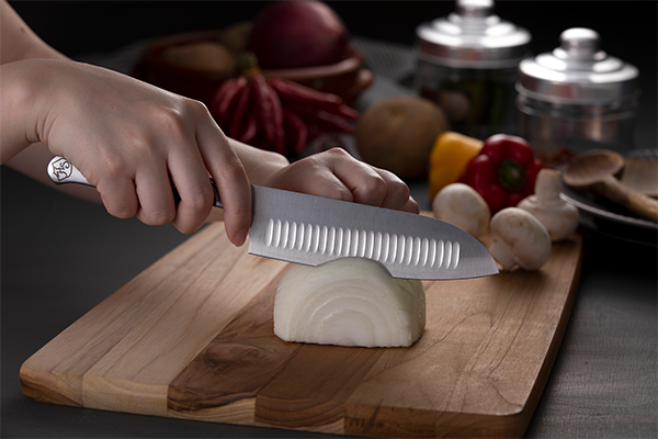 三徳包丁には、両刃にデポット加工(凹凸処理)が施されています。この加工により魚や野菜などの食材の刃への張り付きが低減されるため、食材の刃離れが良くストレスフリーでお料理を楽しむことができます。