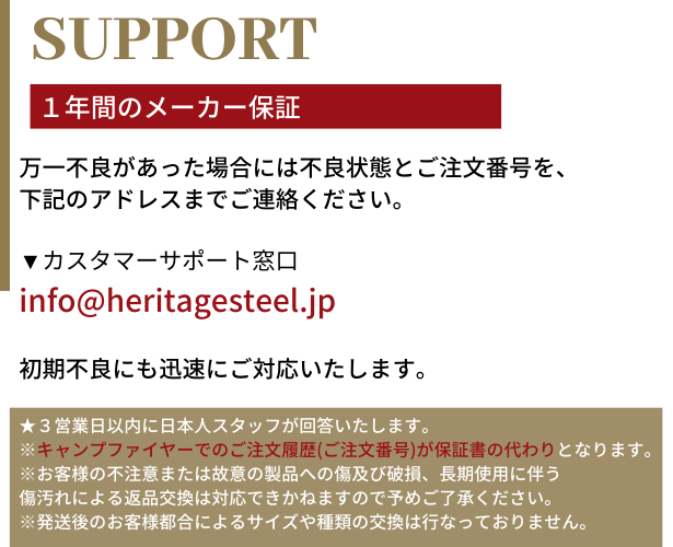 当プロジェクトではHeritage Steel(ヘリテージスティール)の日本正規代理店が商品を管理しておりますため、正規品をお届けいたします。また商品は日本に輸入する際に必要な検査を受け、食品衛生法をクリアしております。万一の初期不良には日本国内で返品・交換の対応をいたします。