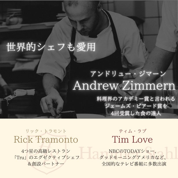 Andrewは料理界のアカデミー賞と言われるジェームズ・ビアード賞を4回も受賞した食の達人で、世界でも影響力のある有名シェフの1人として知られています。Andrewに認められたHeritage Steelの調理器具は彼のレシピ動画にも度々登場しています。