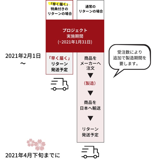 超早割で「早くお届け」の特典が含まれるリターン(30~35%OFF)は、すでに国内に在庫のある商品です。商品は当プロジェクトの終了予定日である2021年1月31日以降に順次発送となり、2021年2月上旬中に配達予定でございます。