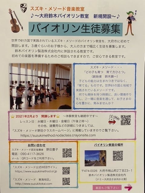 スズキ・メソードのバイオリン教室が大府市で開講するのは初めてで、世界60ヶ国以上で広まっているスズキ・メソードですが、「大府鈴木バイオリン教室」は鈴木バイオリンと一体となった世界に一つだけの教室です♪