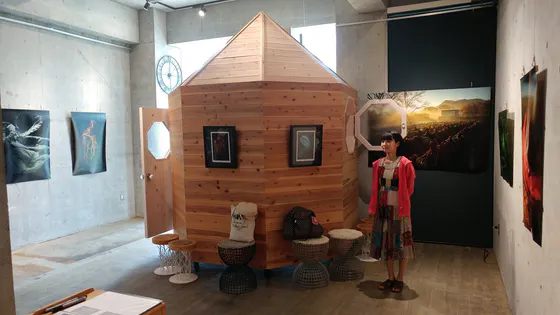今回下見したギャラリーは、写真の通り木でできた『ハコ』のようなオブジェがあり、その中に入ってパフォーマンスもできる楽しい空間でした(^^♪ 外から差し込んでくる自然光もステキ。