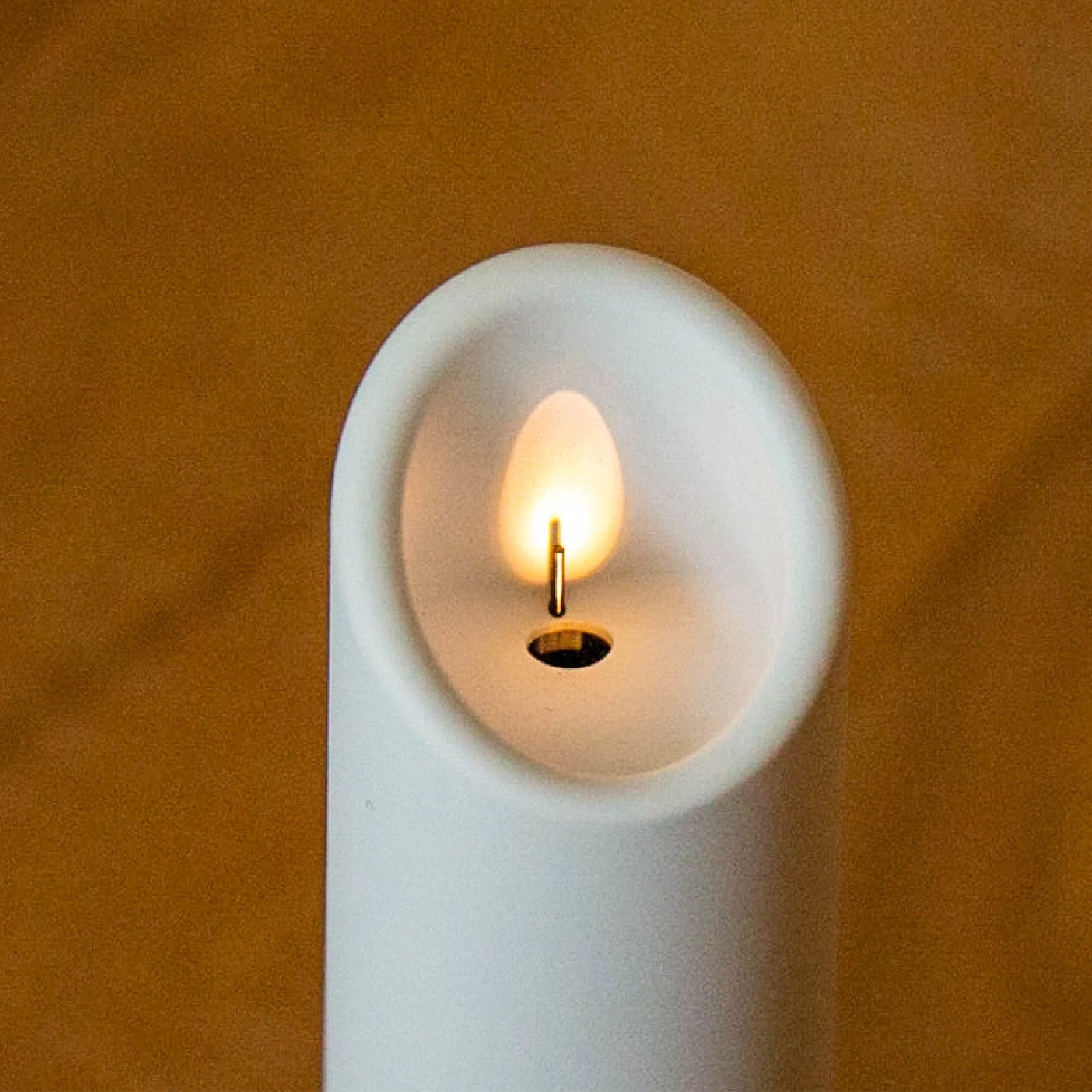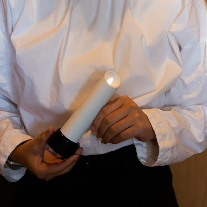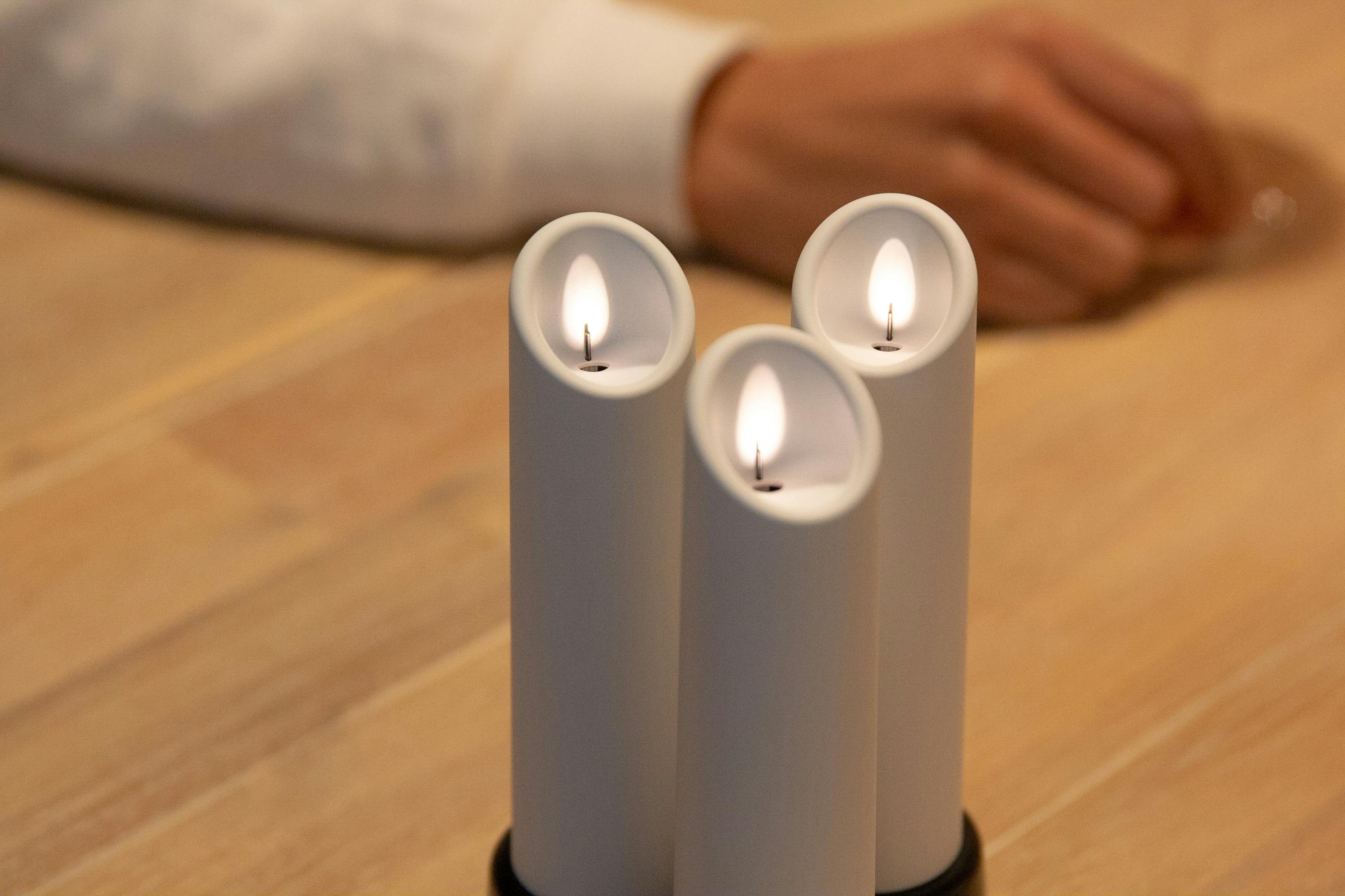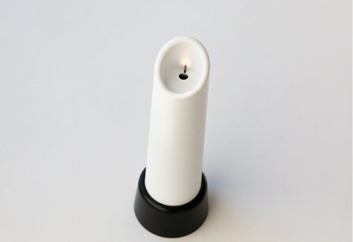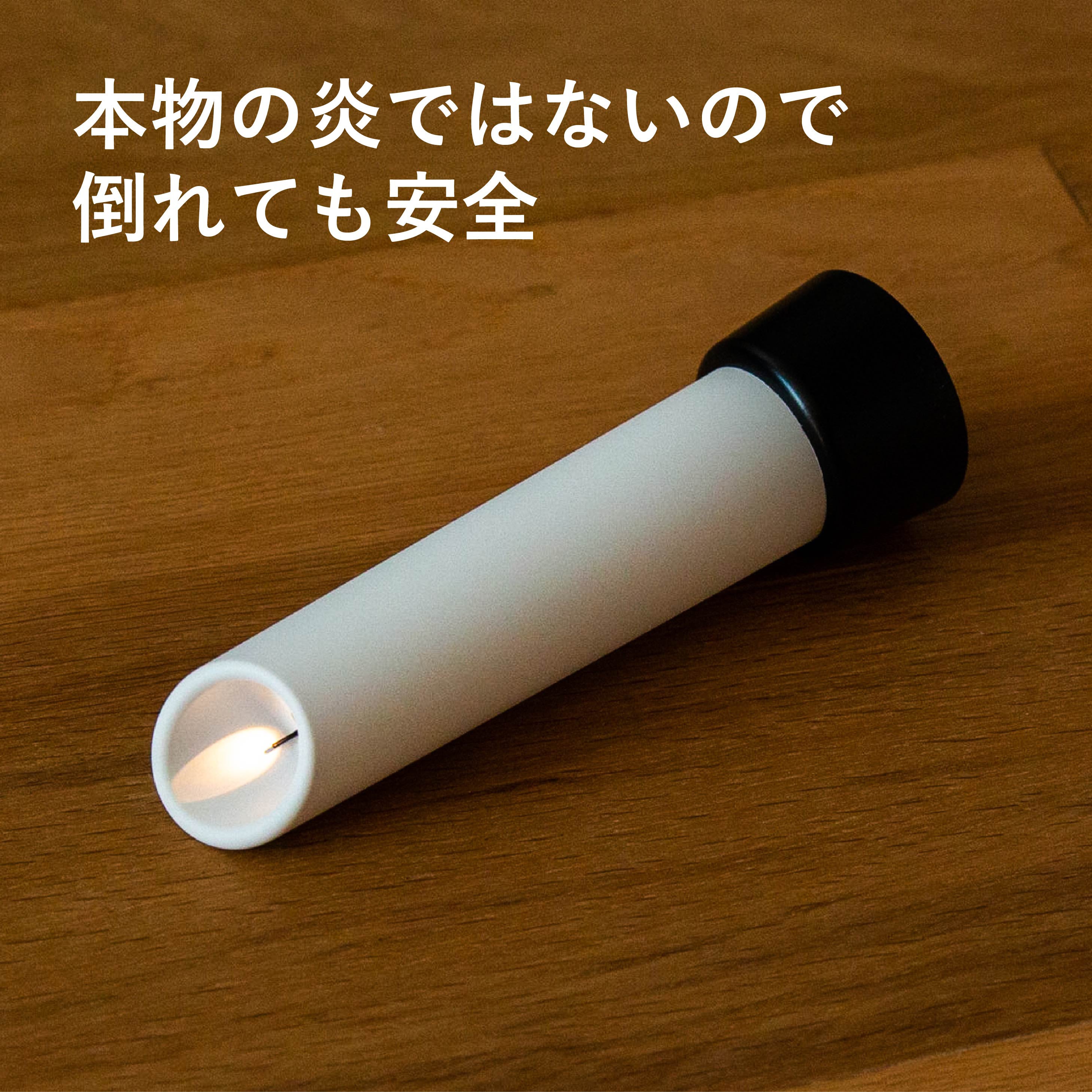 キャンドル型のフォルムにLEDライトの光を当てて灯し、ロウソクの炎を再現。