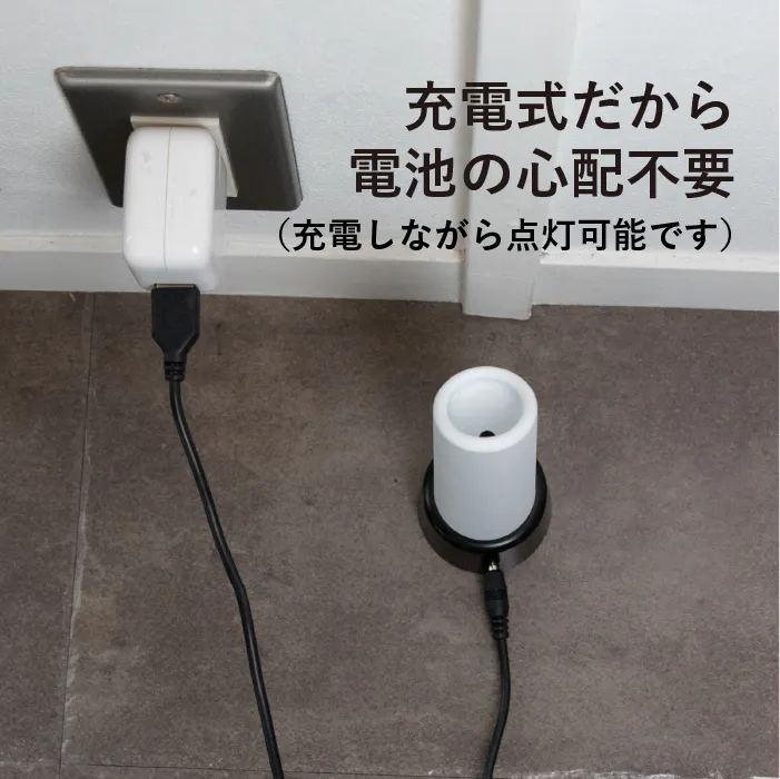 オート設定にすると暗くなると自動で点灯。炎を使わないから枕元や玄関のフットライトなど就寝・お出かけといった際に、炎の始末で頭を悩ませることもありません。充電式なので電池交換不要。1回の充電で10日間も持つので、つけっぱなしでもOKな手軽さです。