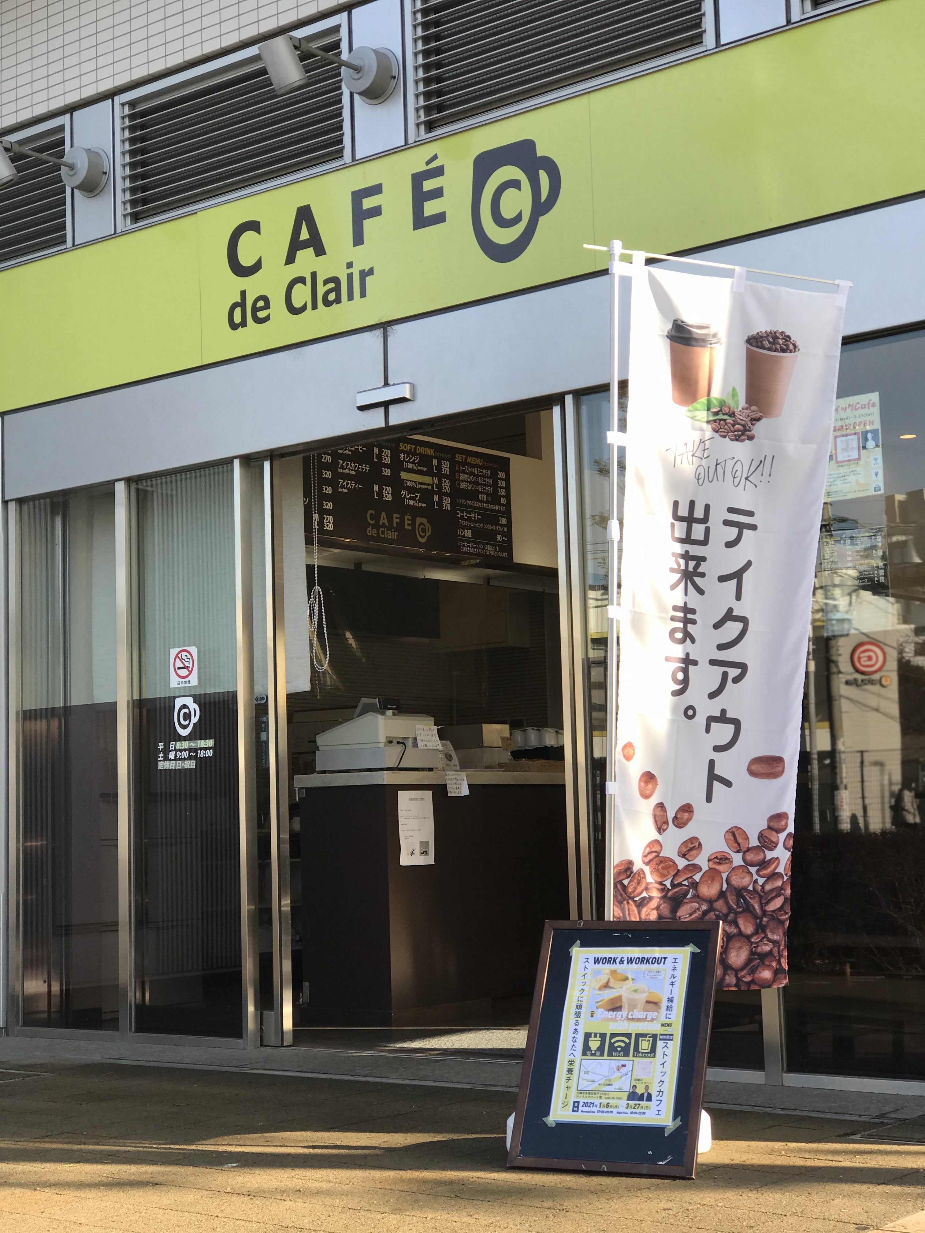 2021/01/25 11:20おはようございます!ストイックカフェ本日も元気に営業しました。現在、緊急事態宣言が再度発令された事もあり、朝:7:00〜9:00夜:18:00〜21:00 → 20:00 の時短営業で行っています。(※無休)我々はこのコロナ禍でも皆様にプロテインスムージーをお届けする為、テイクアウトにも力を入れています。(新しいのぼりを購入し、アピール中です!!)※看板は場所をお借りしているカフェ様の名前が記載されています。よくお客様にお聞きされるのですが、9:00〜18:00は私たちが場所をお借りしている元々のカフェさんが営業されています。私たちはそのカフェの営業時間外をお借りする形で営業しています。屋号は違いますがこの黄色の看板や立て看板、のぼりを目印にお越し頂ければ幸いです。皆様のご来店お待ちしております。宜しくお願いします!ぼぶ もっと見る
