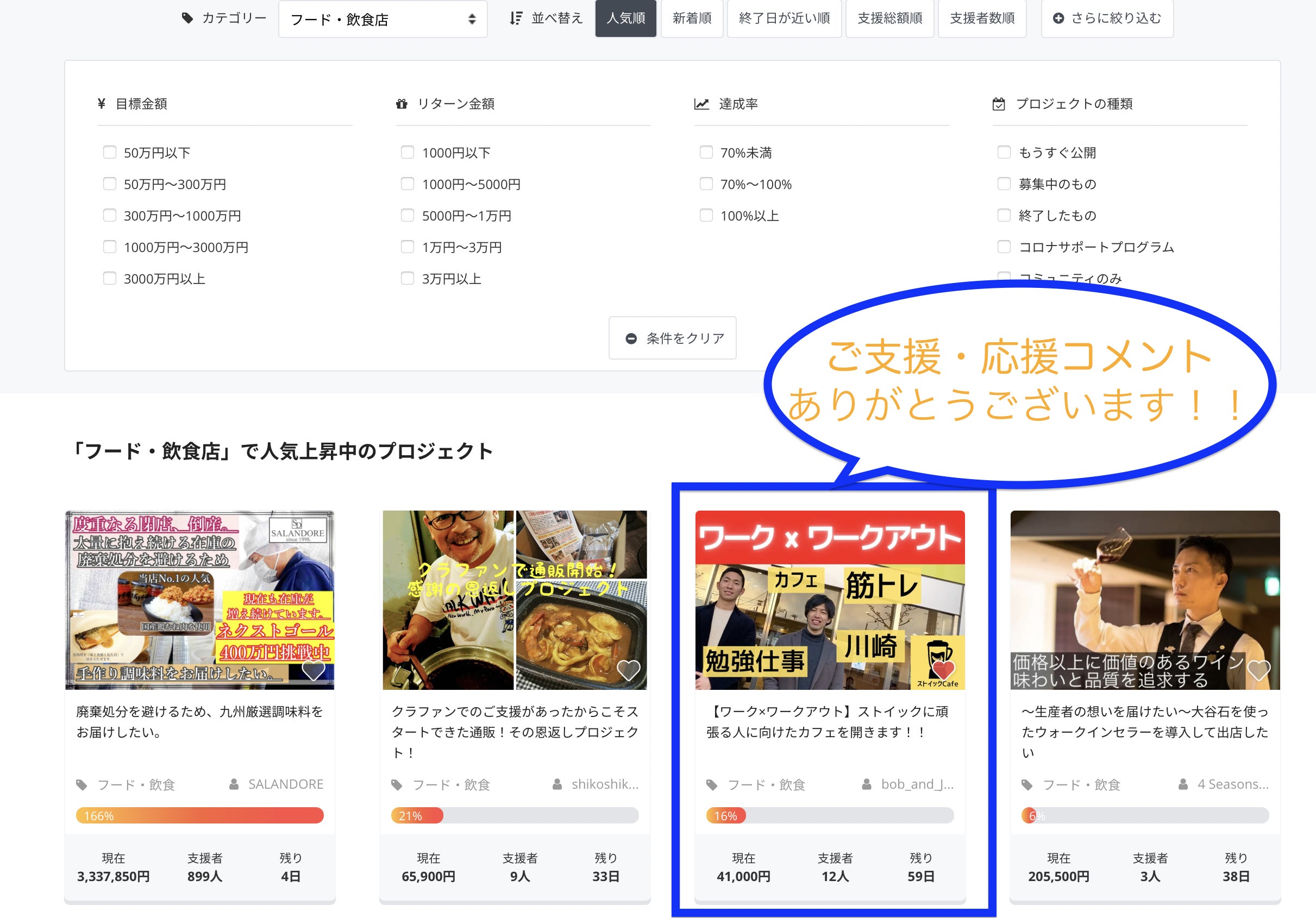 こんばんは!昨日の20時から始めた本プロジェクトですがわずか1日で募集金額全体の16%ものご支援を頂くことが出来ました。ご支援、応援コメントをして頂いた皆様本当にありがとうございます!頂いたお金はカフェ運営費として大切に使用させて頂きます。また短期間で多くのご支援、応援コメントを頂戴した結果、フード・飲食店カテゴリで人気急上昇プロジェクトとして掲載されました!!引き続き目標金額達成に向けて、ぜひ皆様のお力をお貸し頂けると幸いです。よろしくお願いします!ぼぶ