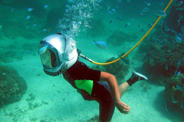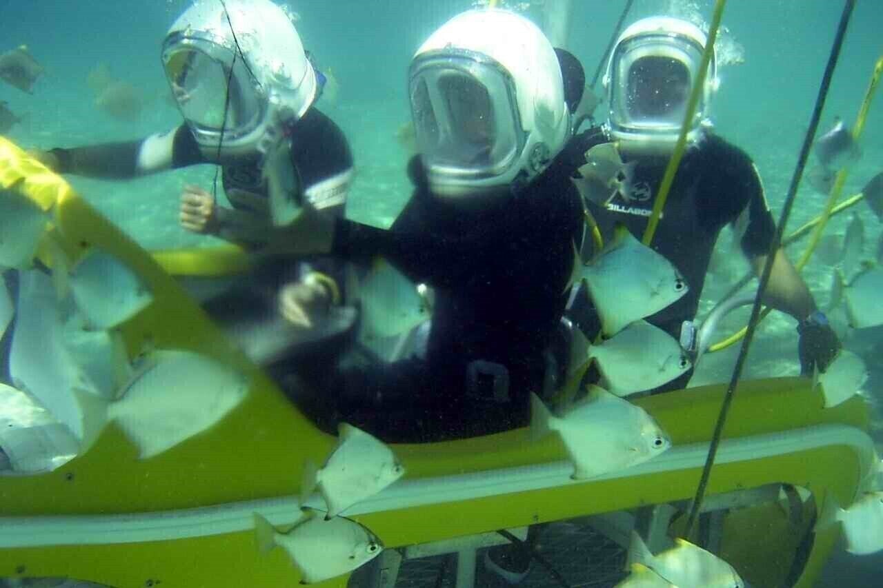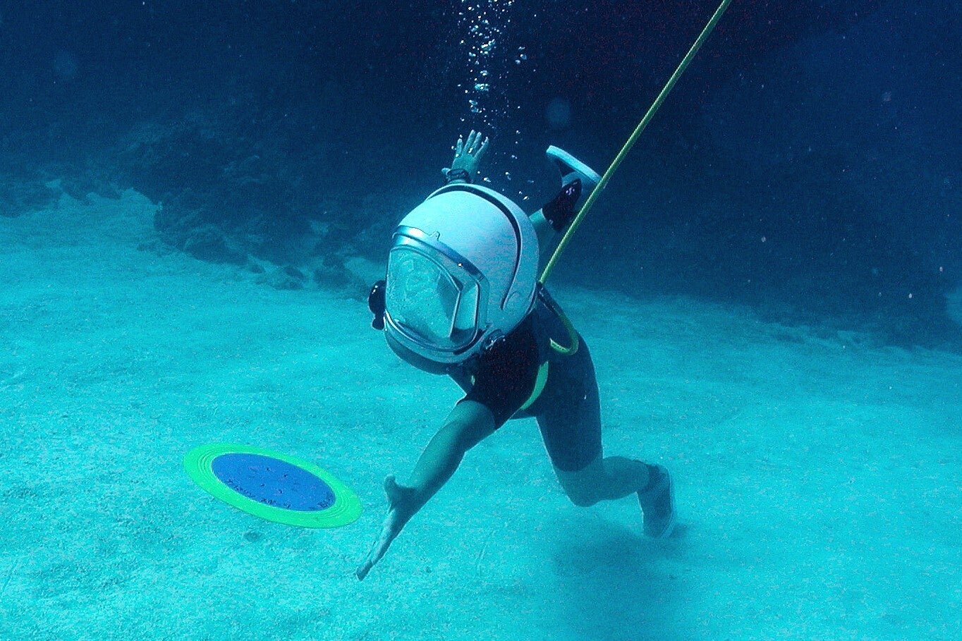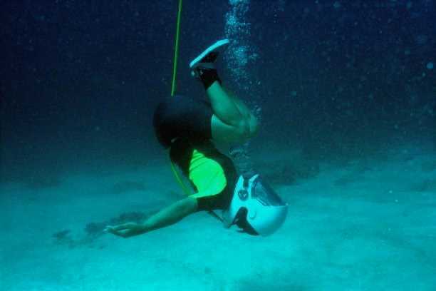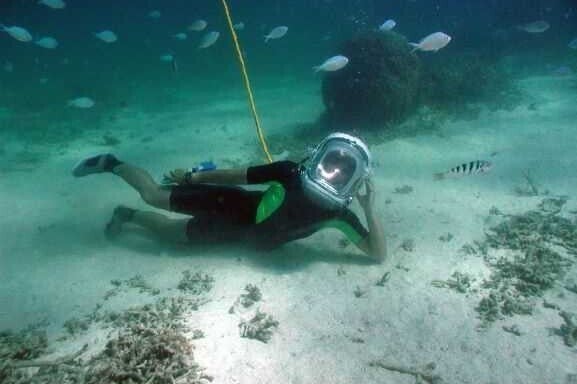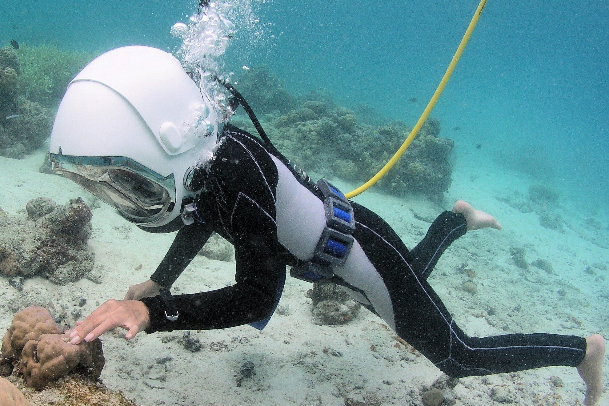 私共の旧型モデルが備えていた軽量・防水性能を活かした今回の新型モデルは、海中で逆立ちできる自由な活動性が保証されている為に、制限なく魅惑的な海中世界に迫る事が出来且つ、動画撮影や海中環境調査をする事が可能で、サンゴの海のレンジャー体験を可能とします。(他社のシーウォークヘルメットは平均35KGと大変重く防水性もないので、海底で直立姿勢を維持しなければならず、頭部に重量が集中している為に上下を向くと転倒し、海水が一気にヘルメット内部に入り、呼吸も視界も失われます)