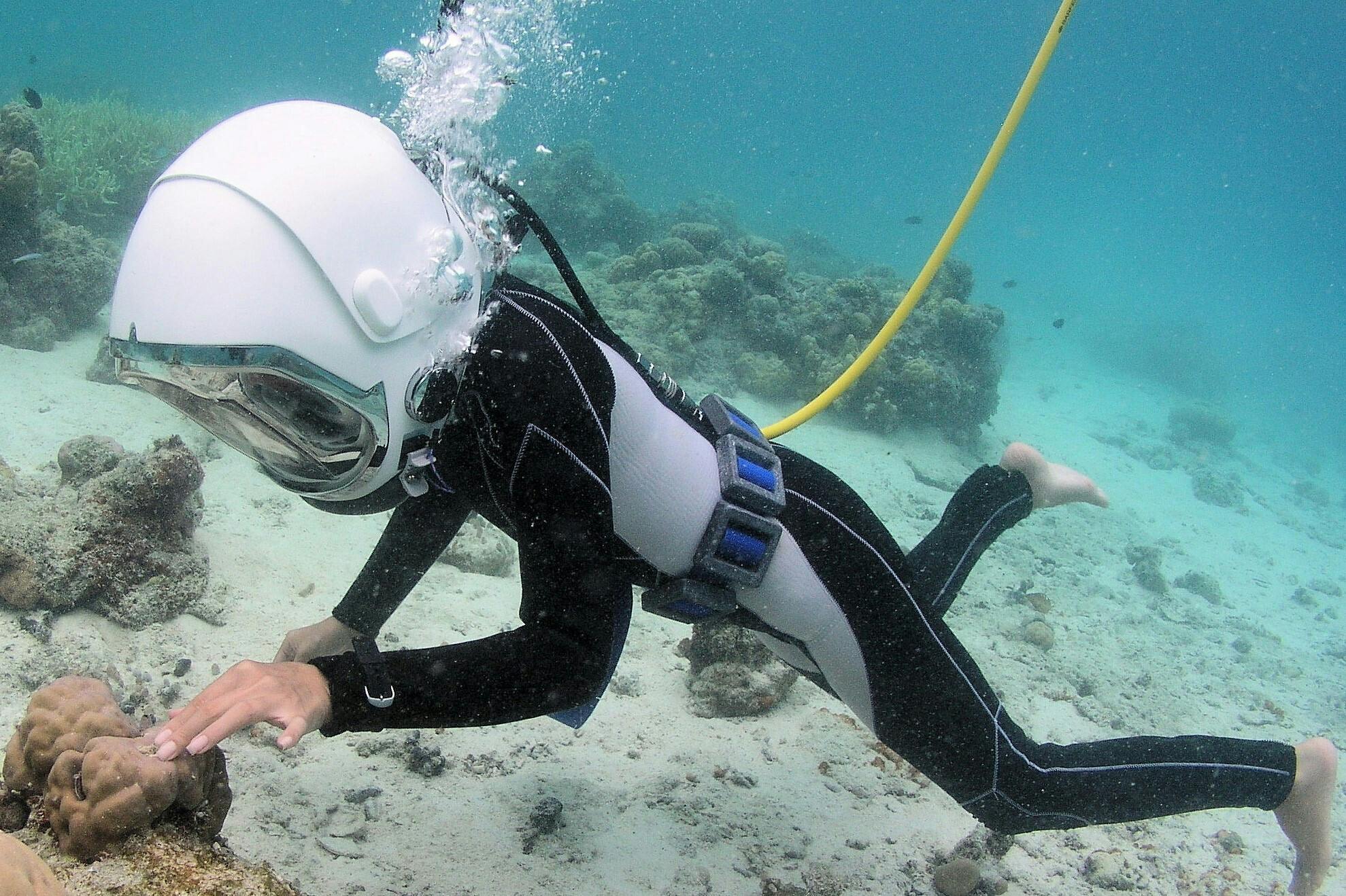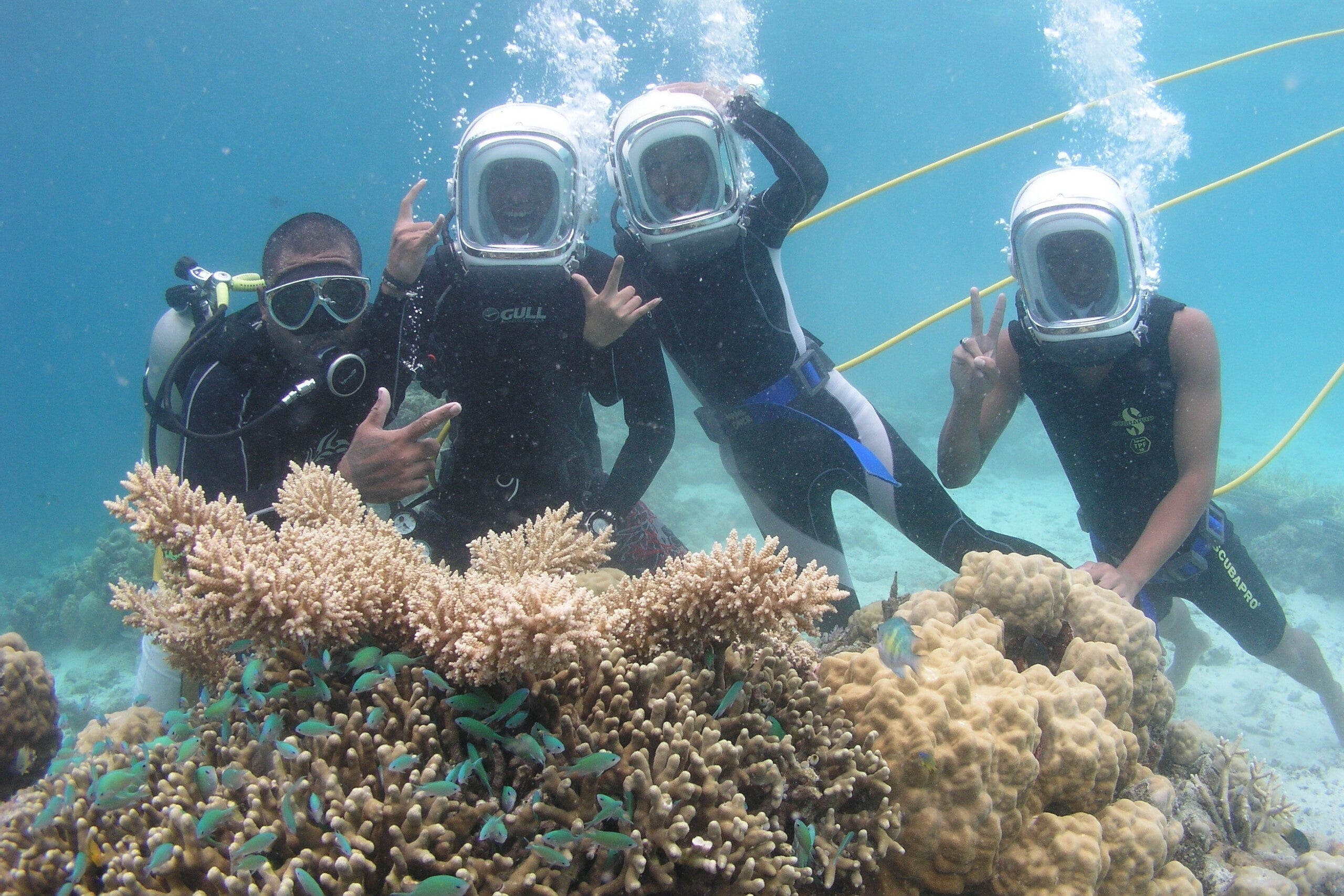 ダイビング未経験の観光客が、自然界の海での天然水族館体験を通して、”サンゴの海の守り人”になれる海中探検用ヘルメットのニューモデルを完成させました。このヘルメット及び、それに接続する器材「海中環境モニター」開発へのご参加を通した、SDGs活動への支援事業です。