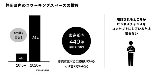 地方都市でもコワーキングスペースは増えています。静岡県は2020年10月時点で24件、2015年の4件からは6倍となっています。しかし、都内の件数(2021年1月時点で440件)に比べるとまだまだ、浸透しているとは言いにくい状況です。
