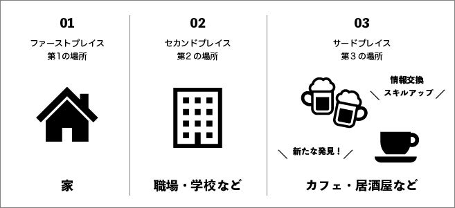 住む場所を「第1」、働く場所を「第2」とした場合に、それ以外の家族と仕事の領域を超えて、個々人が集まって語り合う場などのことを言います。わかりやすい例が飲み屋や昔でいうサロンやカフェなどです。