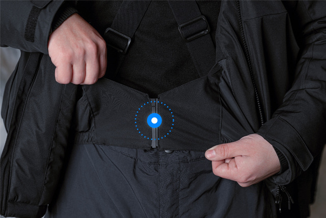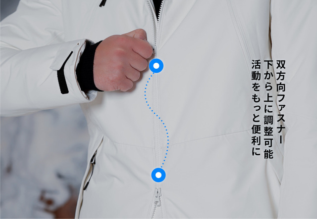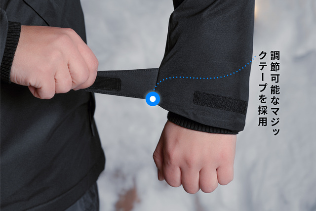腰部分にジャケットの下端から冷たい風や吹雪が流れ込むのを防ぎ、裾(すそ)から中の熱が漏れ出るのも防ぐベルトを備えています。