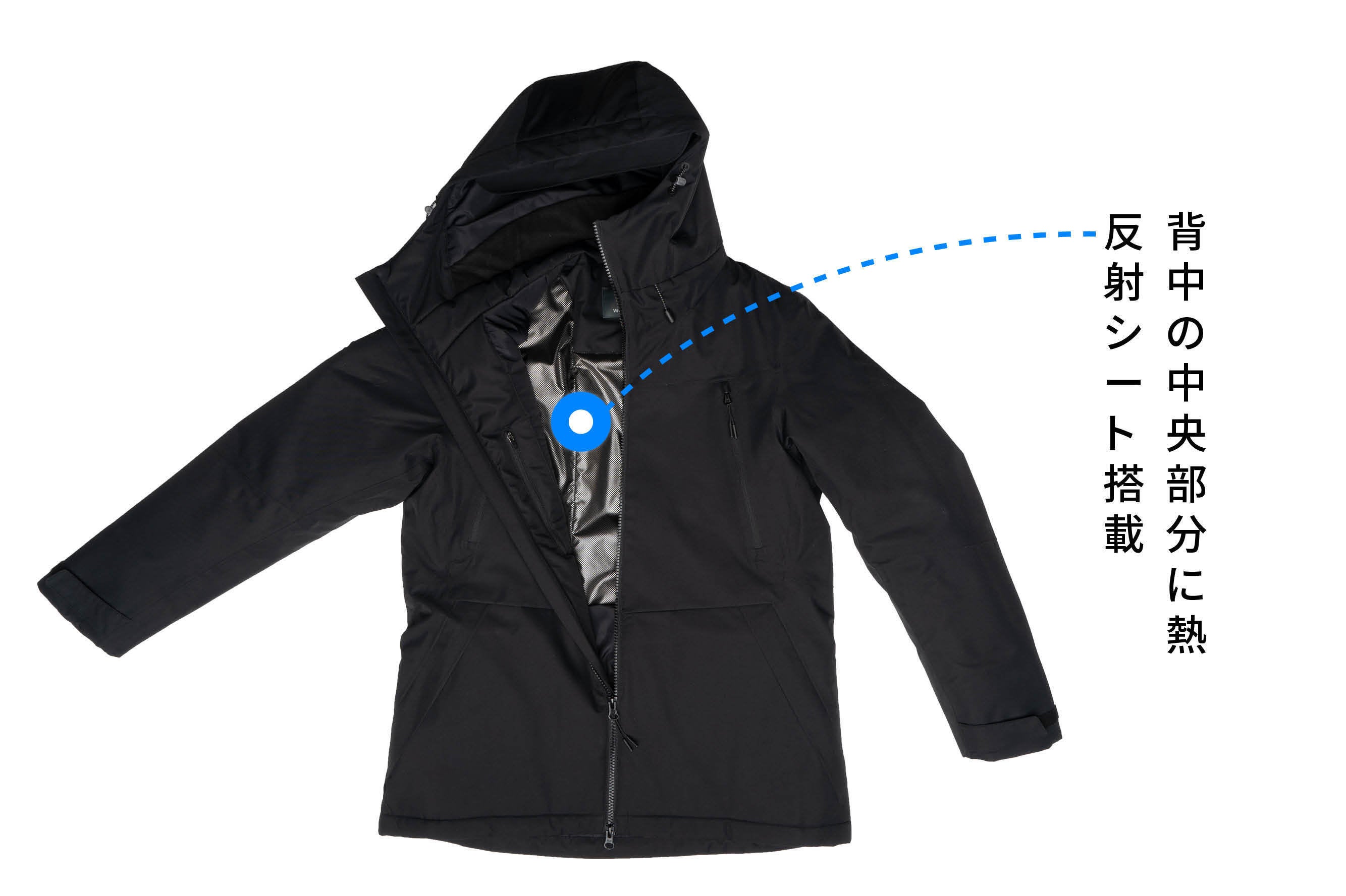 ボレアスジャケットの裏地にナノ銀で加工し、人体が放出する熱(赤外線)を反射して外に逃がさないため、保温性を高めます。