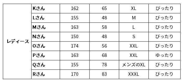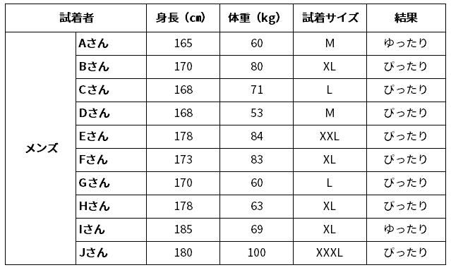 なお、「どのサイズを選べばいいのか分からない。」と悩まれている方に向け、今回身長や体重の異なる18人にボレアスジャケットを試着して、それぞれにぴったりのサイズを選んでくれました。そのデータを参考にしてください。