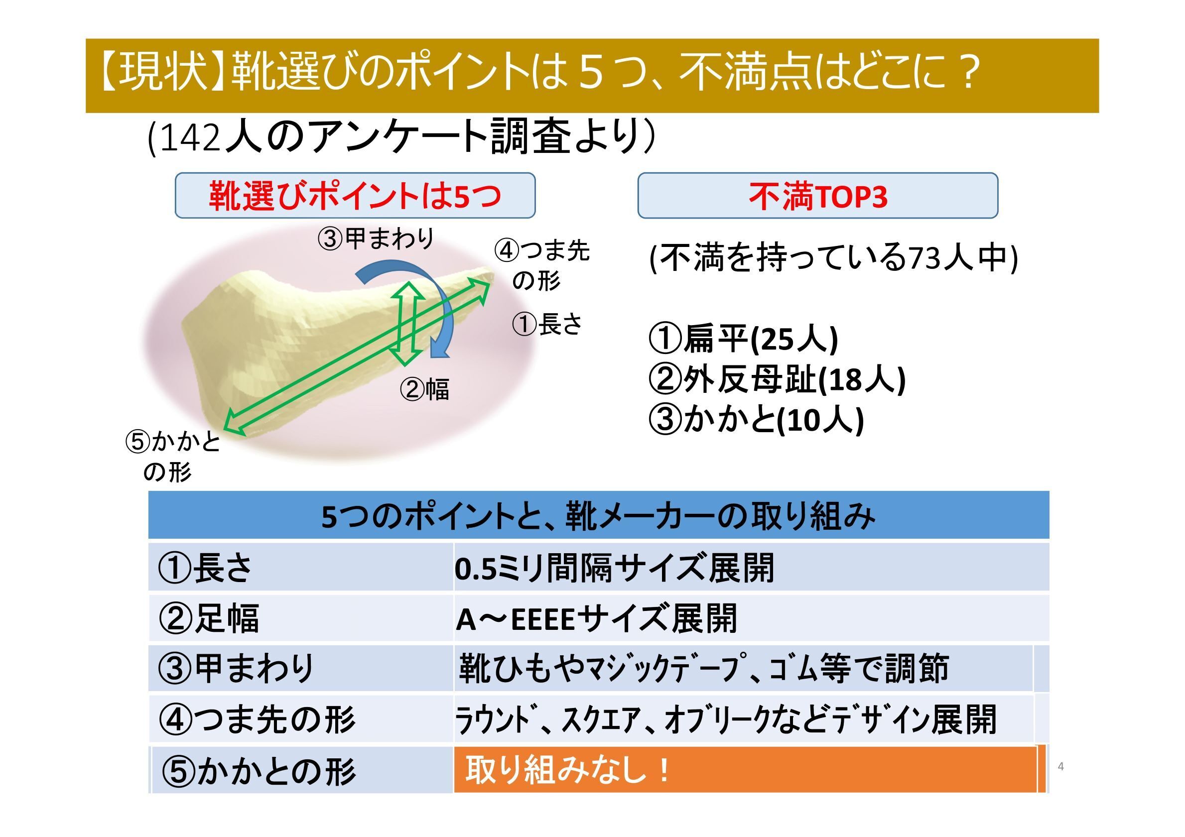 図のように、靴メーカーさんも①〜④のポイントに対してはさまざまなバリエーションを用意しています。靴のJIS規格には①②が反映されていますが、⑤に関しては、踵幅はもちろんのこと、出っ張り具合をカーブ度数計測器を用いて足型調査されていますが、JIS規格には反映されていません。