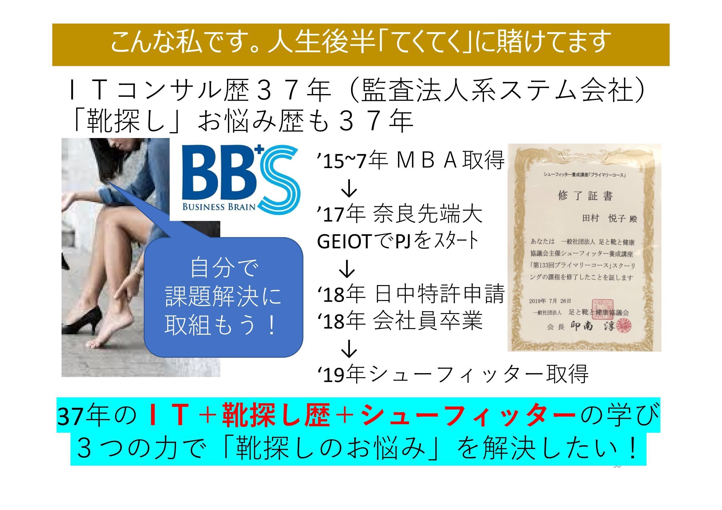 このビジネスは、私自身の長年の思い「靴ジプシー」のお悩み解決に向けて、3年前に奈良先端科学技術大学院大学GEIOTにてプロジェクトベースでスタートしました。その後、個人事業主として特許申請、ものづくり補助金の採択を受け、東京のビジコンでファイナリストに選ばれたことと同時期に特許取得を経て、2020年6月24日、コロナ禍の逆風の中ではありますが、株式会社としてスタートすることになりました。