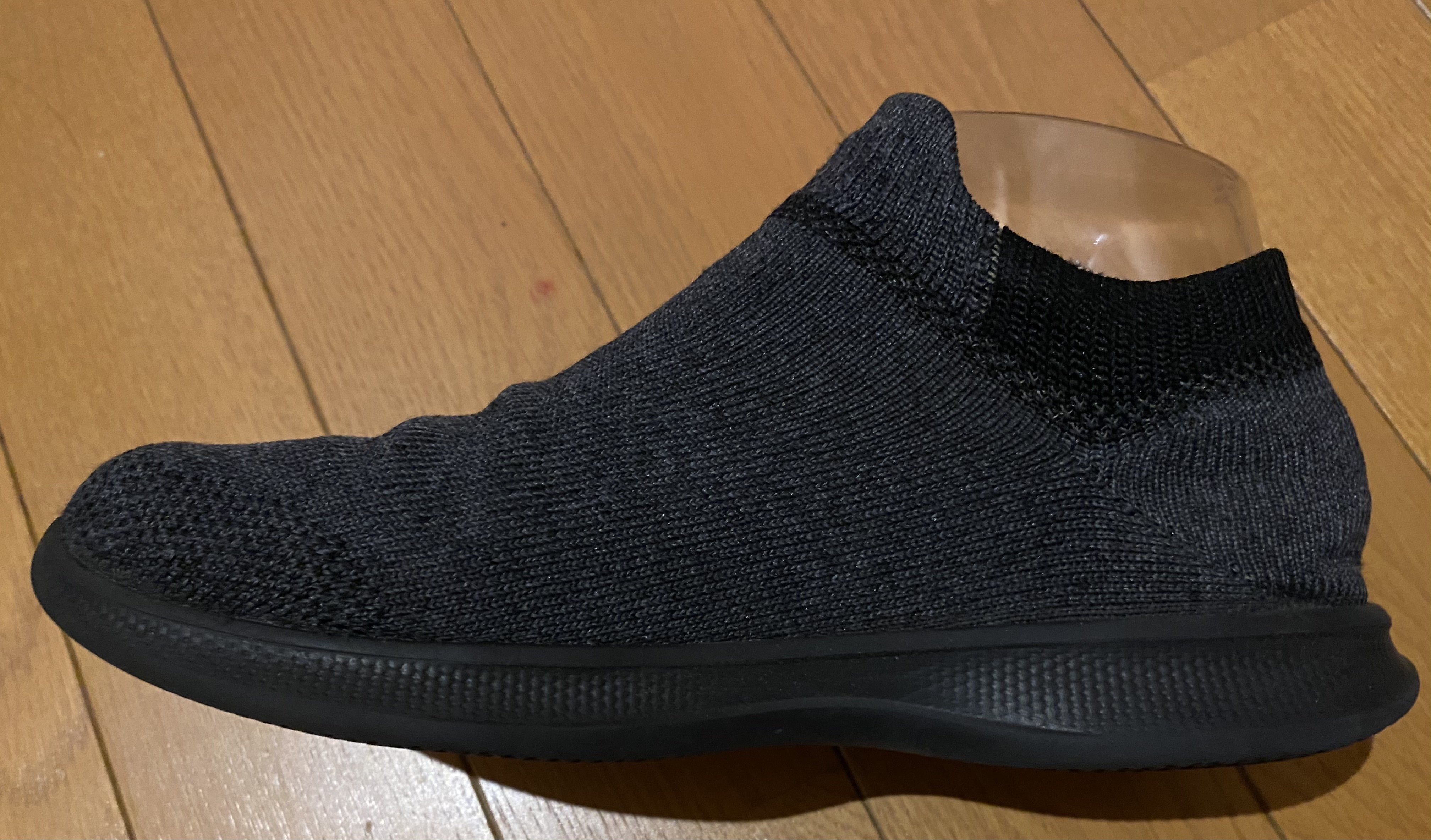 合う靴がないと、どうしても足入れが楽な伸縮素材のゆるい靴を選びがちです。写真のように靴下に底材を貼り付けたようなオール伸縮素材の靴もあります。また「日本人は幅広甲高」という誤った思い込みで幅の狭い靴がほとんど作られず、売り場にはEやEE、EEEと言ったウィズの靴が溢れています。Eがいっぱいあるといい靴とでも言わんばかりに。。。