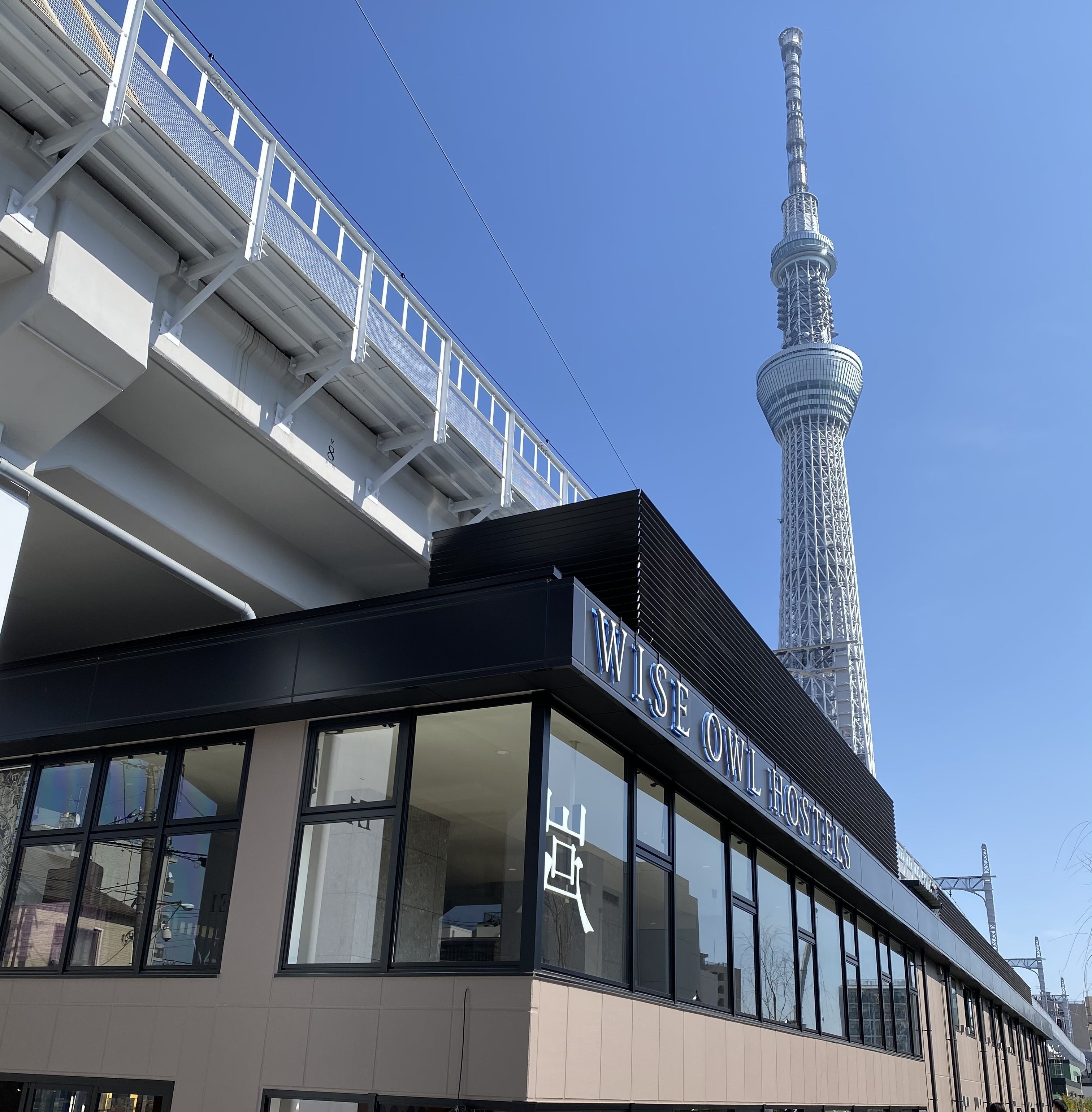 この写真は、浅草とスカイツリーへの徒歩移動が短縮される念願のルート「リバーウォーク」のたもと、東武伊勢崎線の高架下にできた新スポット「ミズマチタウン」に、2021年1月にできたwise wol river hostel さん