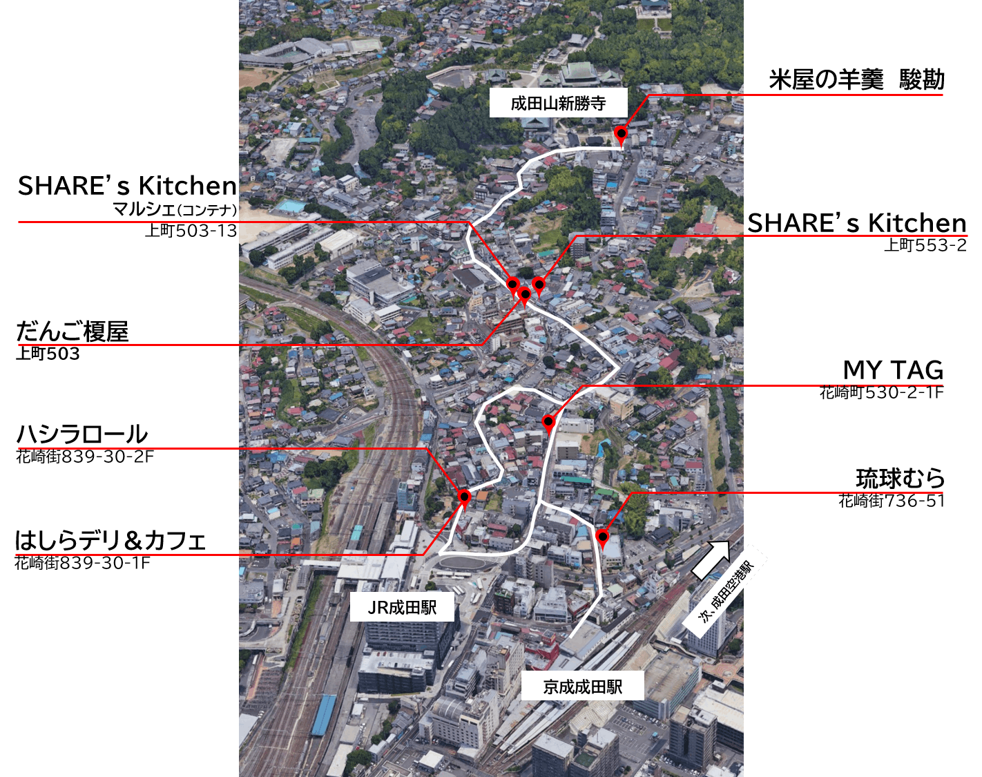 また、最寄り駅である成田駅(JR/京成)から新勝寺までは徒歩数十分かかる為、その区間では様々な商店が乱立しています