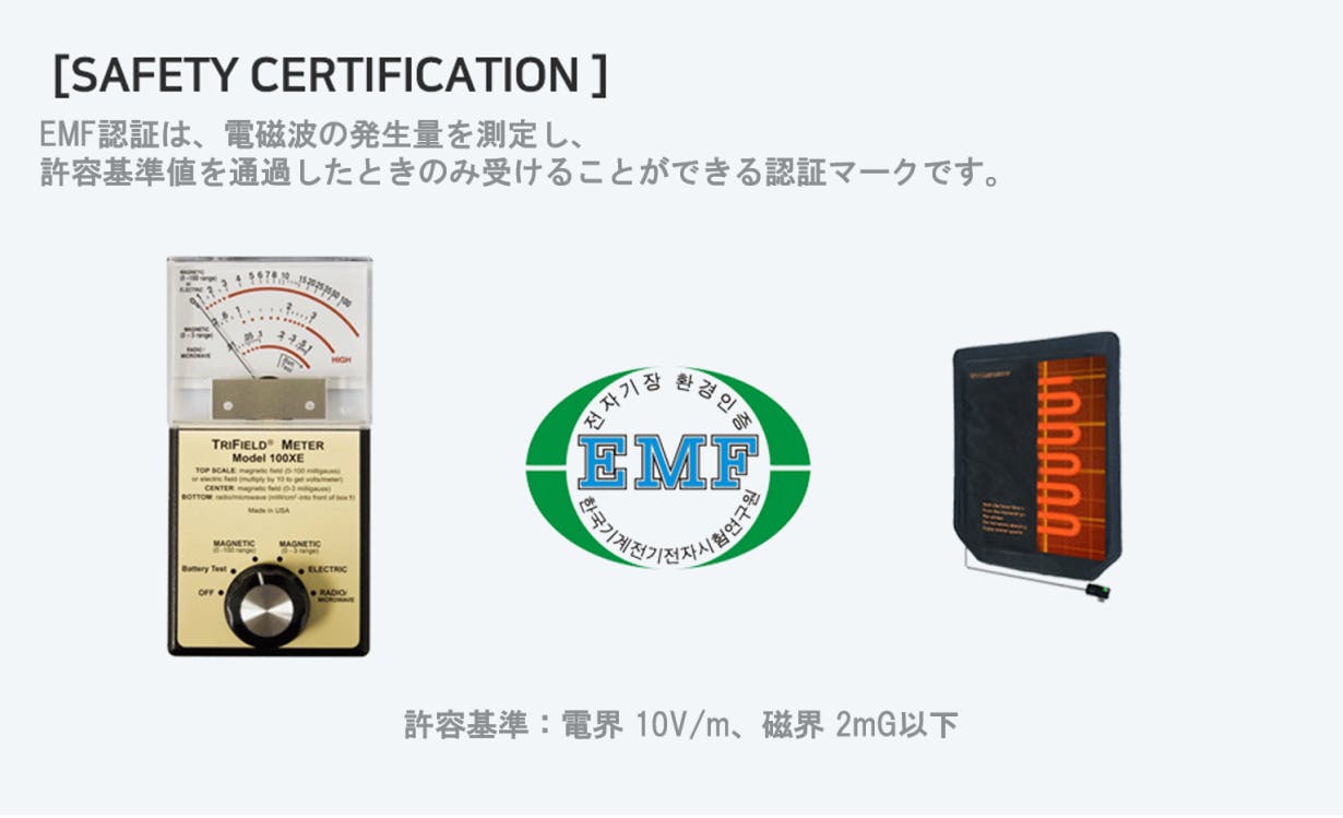 電磁波についてもEMF認証を通過し、EMF認証マークを取得しております。