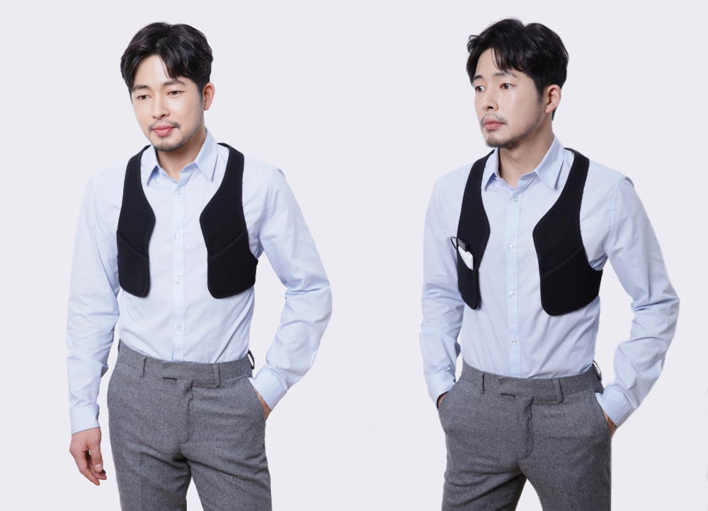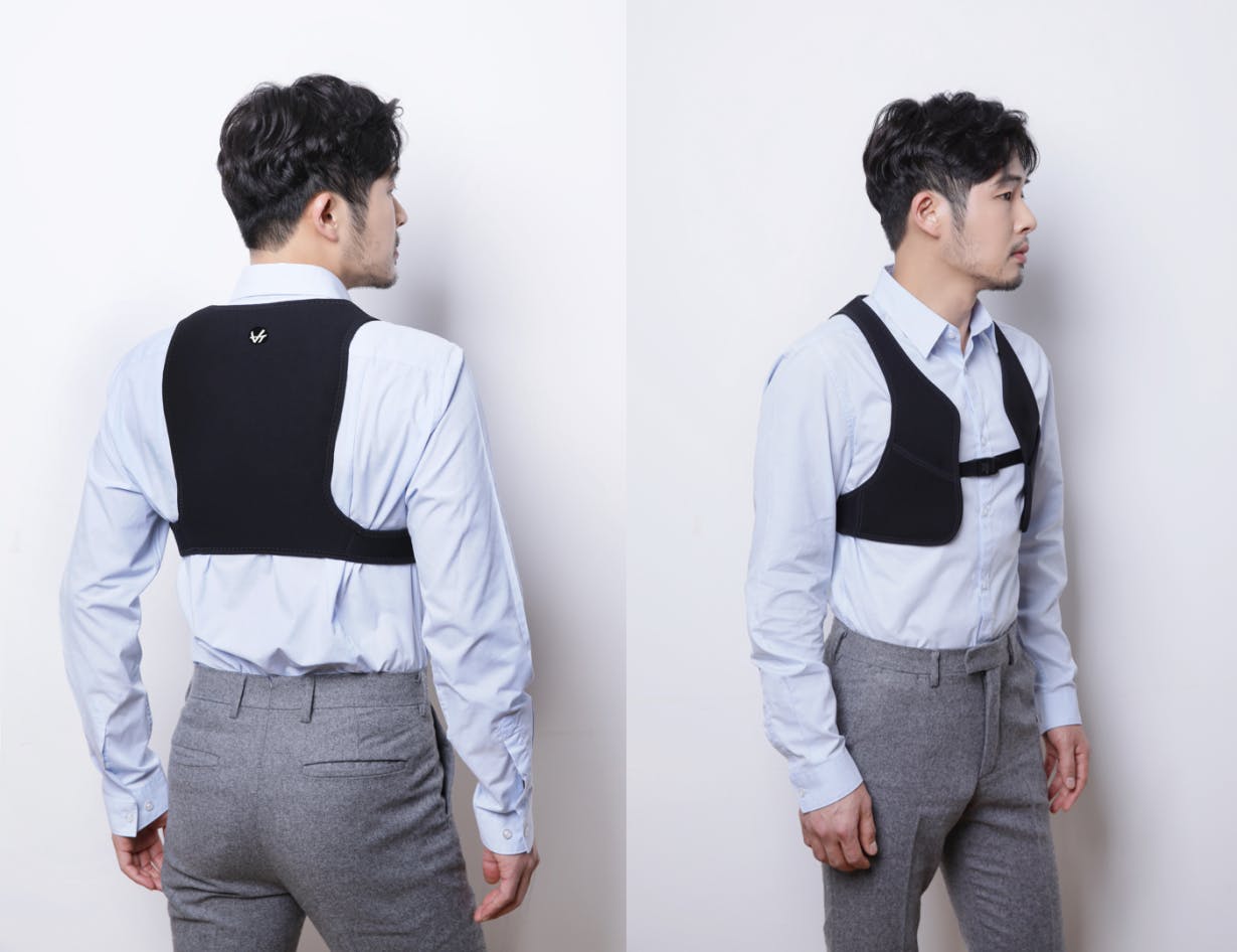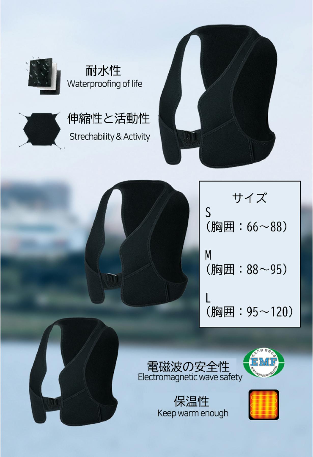 ベスト型にすることにより、上着の内側に装着可能とすることで、多種多様な場面でご利用可能になっております。
