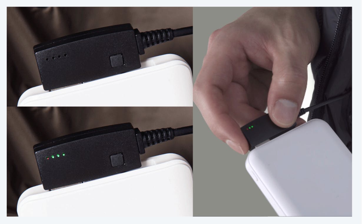 2) 本体に配置されているUSB端子を5Vバッテリー出力ポートに接続させて "□"ボタンを押すと、すぐに発熱が開始され、暖かさを感じることができます。