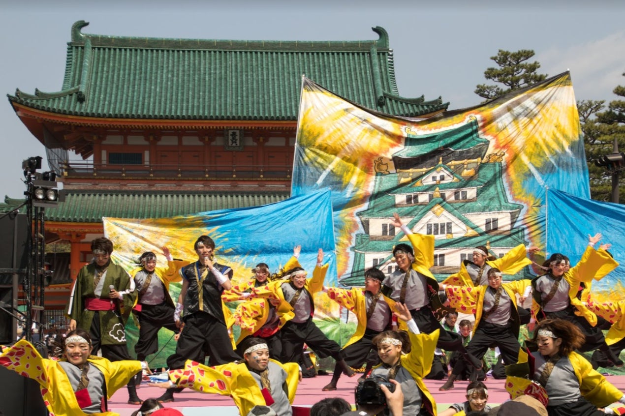 第16回京都さくらよさこいは新型コロナウイルスの影響で開催することができませんでしたが、第15回京都さくらよさこいでは、平安神宮前の岡崎公園会場をメイン会場とし、その他に二条城・京都駅ビルなど京都の名所各所に7つのステージを設けました。当日には京都の桜が満開となり、京都さくらよさこいの名がぴったりとなりました。