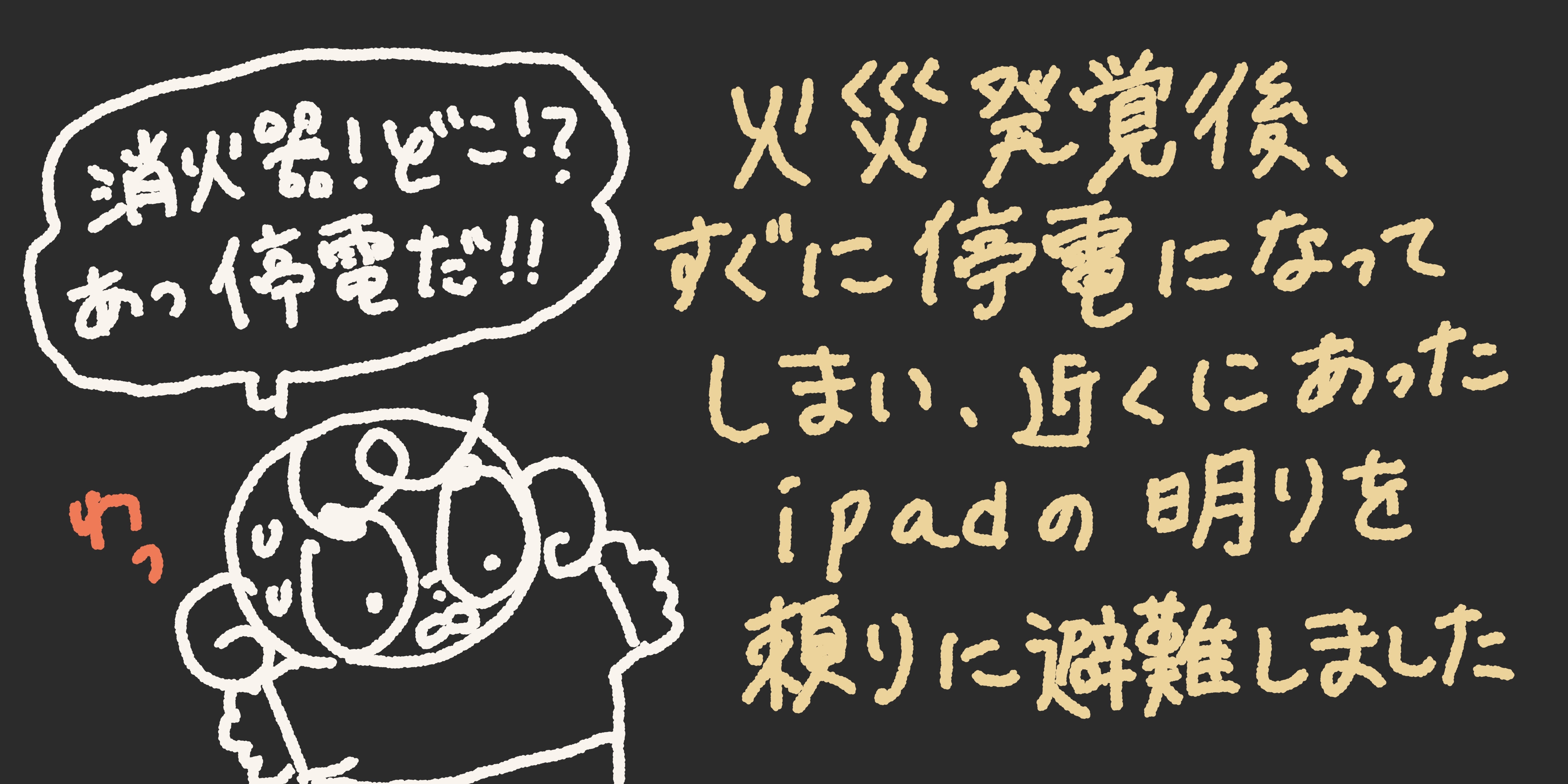 バケツに水を汲みながらも、消化器が要る!と思うと、すぐに停電になってしまい、とにかく避難が先だと思いました。