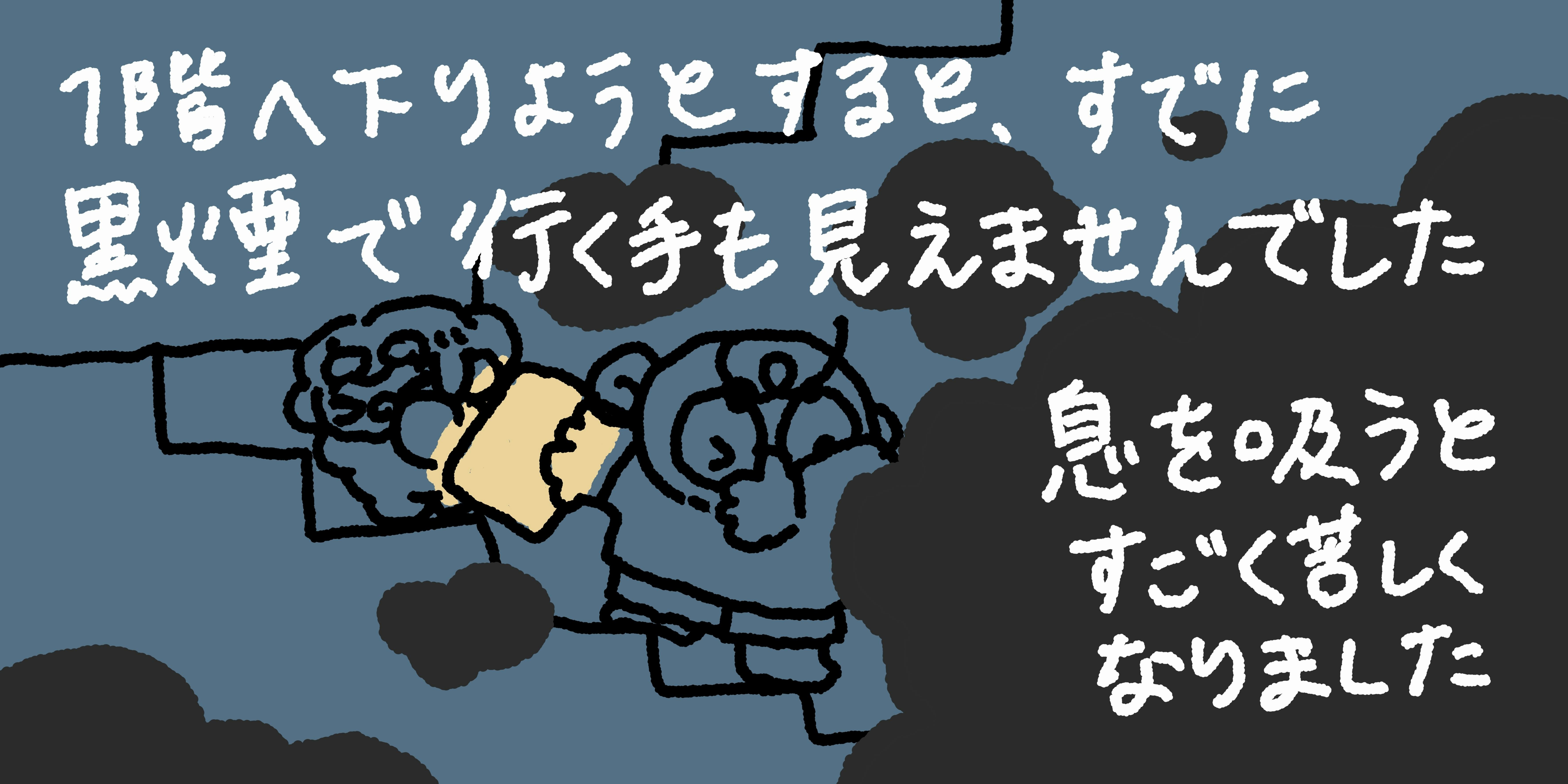 私の自室は2階なので、すぐに階段を下ろうとしましたが、黒煙が行手を塞ぎました。