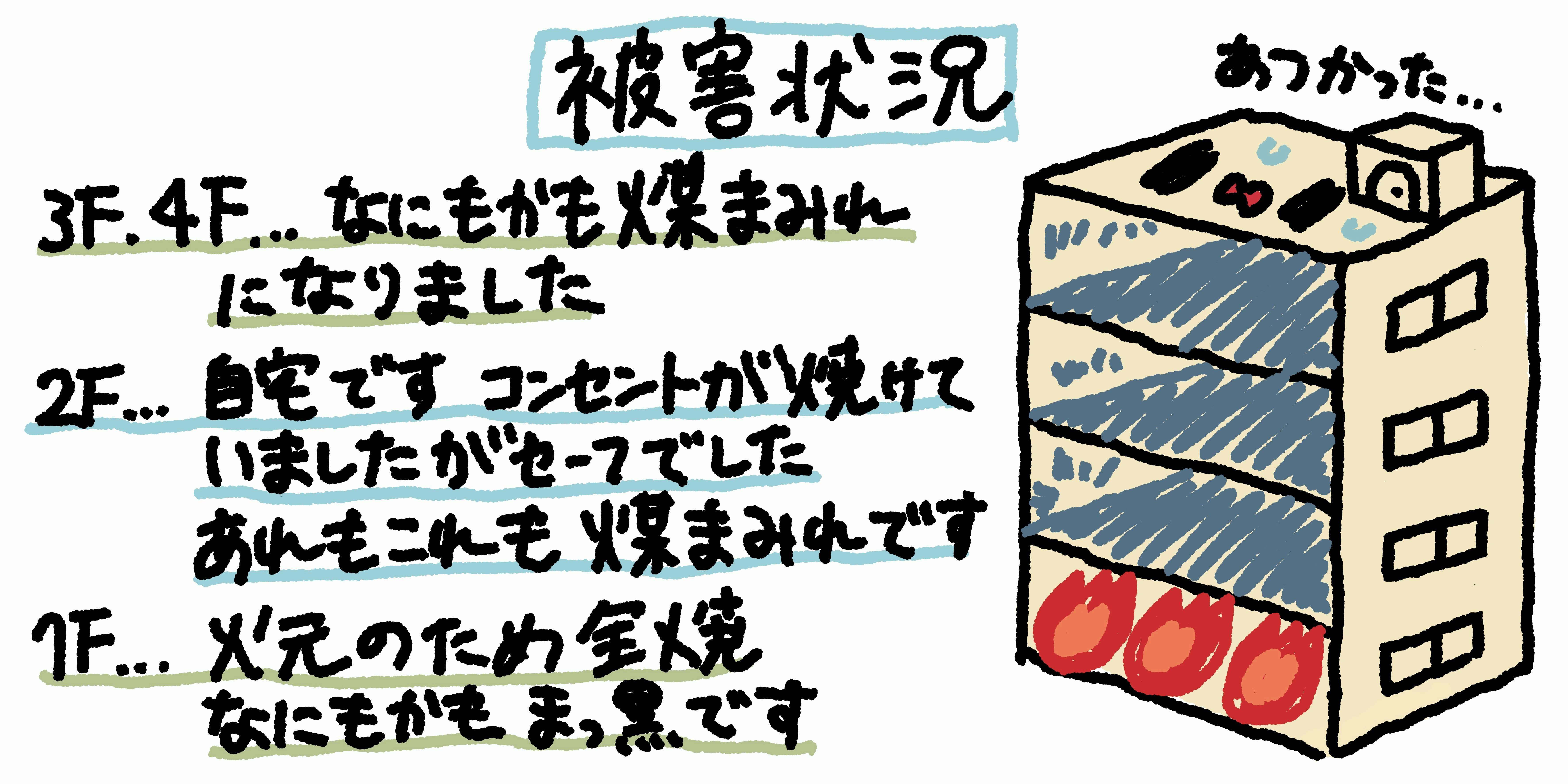親族が居住している階が全焼し、POの住居も被害にあいましたが、POの住居に関しては火災保険に未加入であった為保険適用外となり今回のクラウドファンディングの企画に至りました。