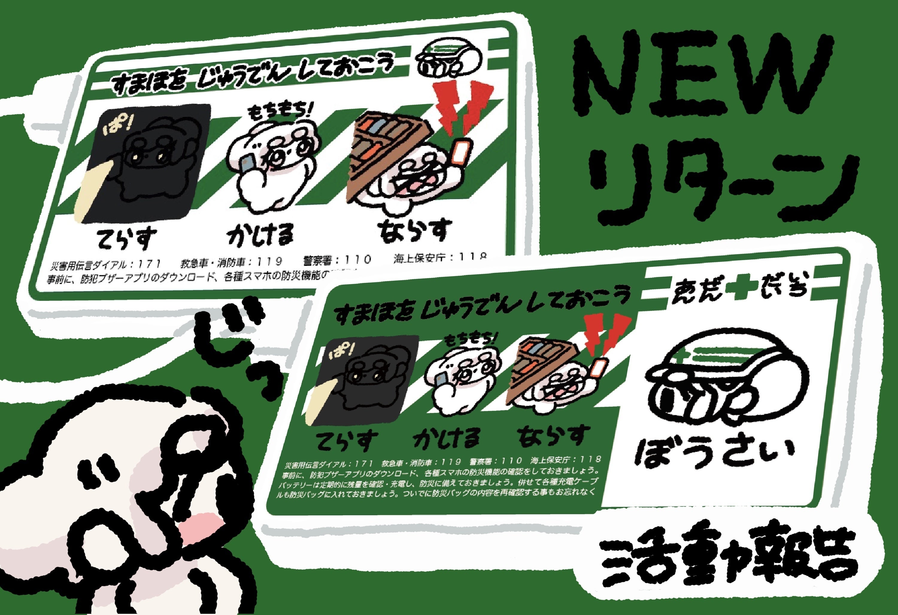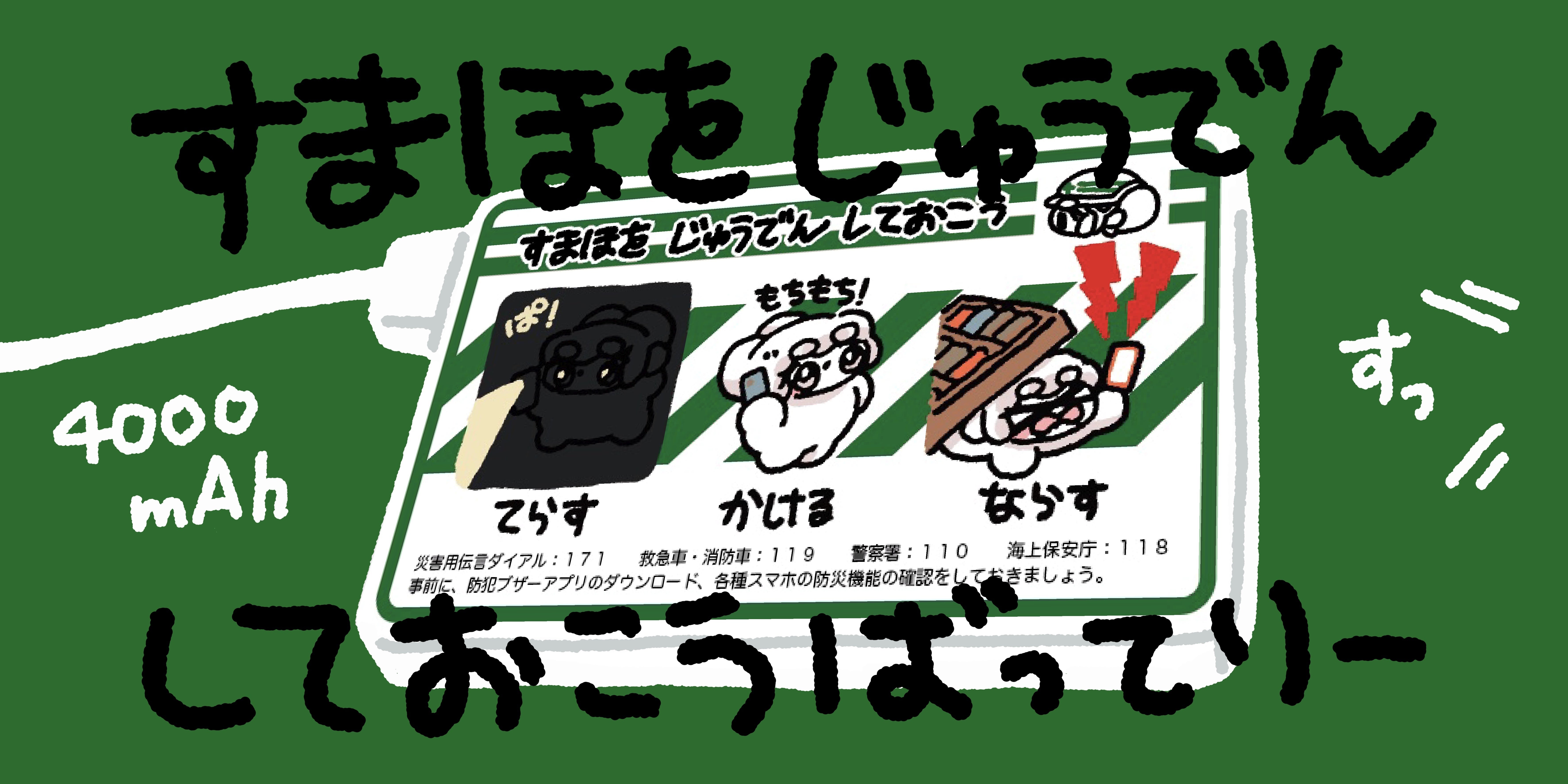 いざというとき、すまほに じゅうでんが あれば できることが みっつ えがかれて いるね ( ( ˘ . ˘( )⊃ )
