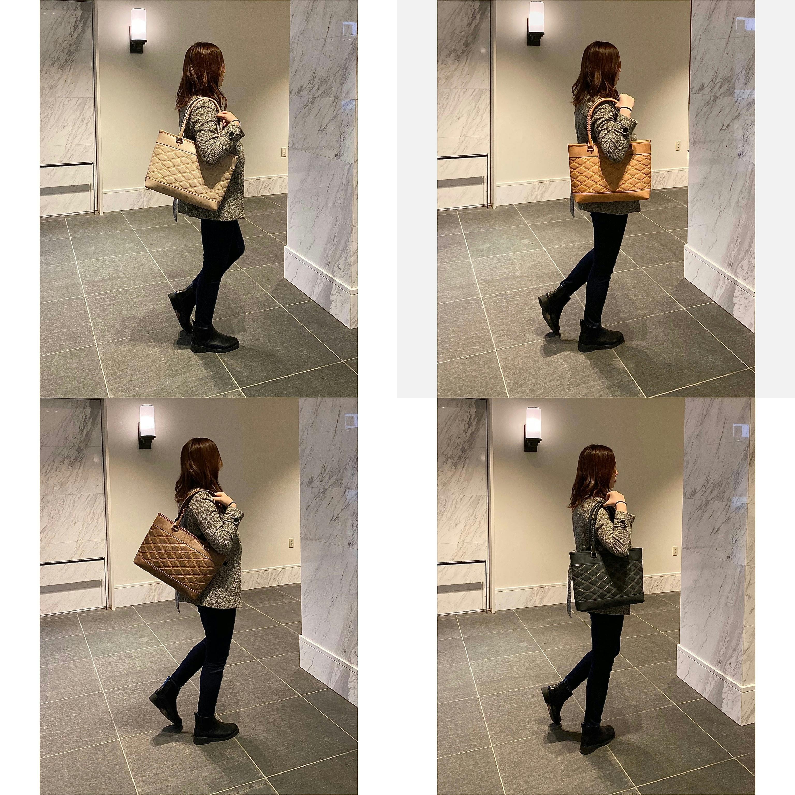 この鞄の特徴的な格子柄のデザインの部分に低反発の芯材を縫いこんでおり、長期使用による鞄の型崩れなどが起きない作りになっています。