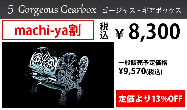 ※ Chrome Rider(クローム・ライダー)、Medieval Hockey(メディーバル・ホッケー)、Gorgeous Gearbox(ゴージャス・ギアボックス)、Cute Double Decker(キュート・ダブル・デッカー)、Tiny Sportcar(タイニー・スポーツカー)はゼンマイ仕掛けはありません。