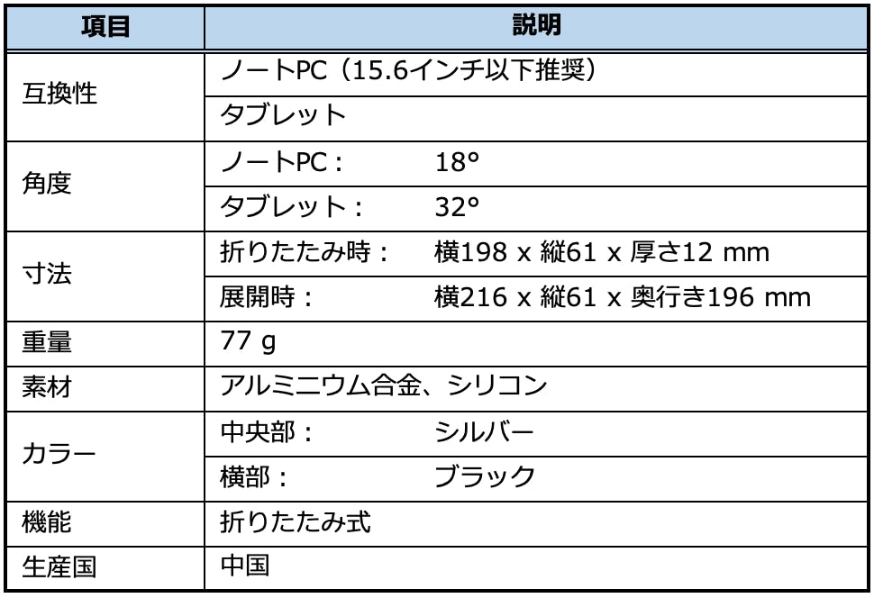 A:【大きさ】折りたたみ時:横198 x 縦61 x 厚さ12 mm、展開時:横216 x 縦61 x 奥行き196 mm、【重さ】77gです。
